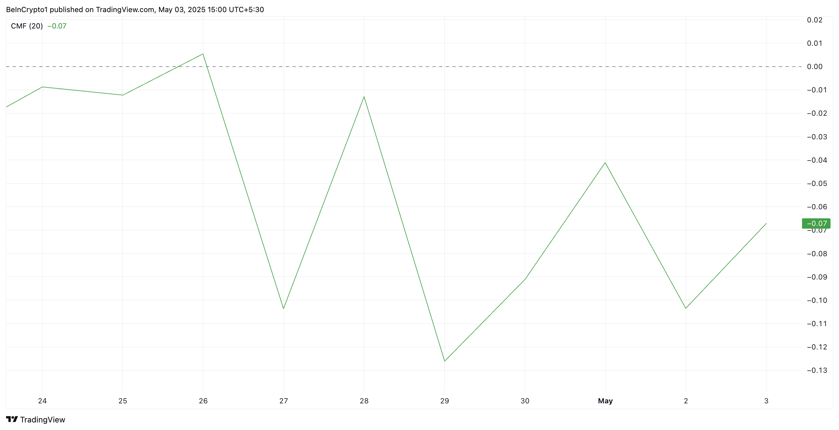 Hỗ trợ cho triển vọng giảm giá này, Chaikin Money Flow (CMF) của HBAR vẫn ở mức âm, báo hiệu sự suy giảm trong khối lượng mua và sự hiện diện ngày càng tăng của người bán trên thị trường. Hiện tại, nó đang ở mức -0.07.