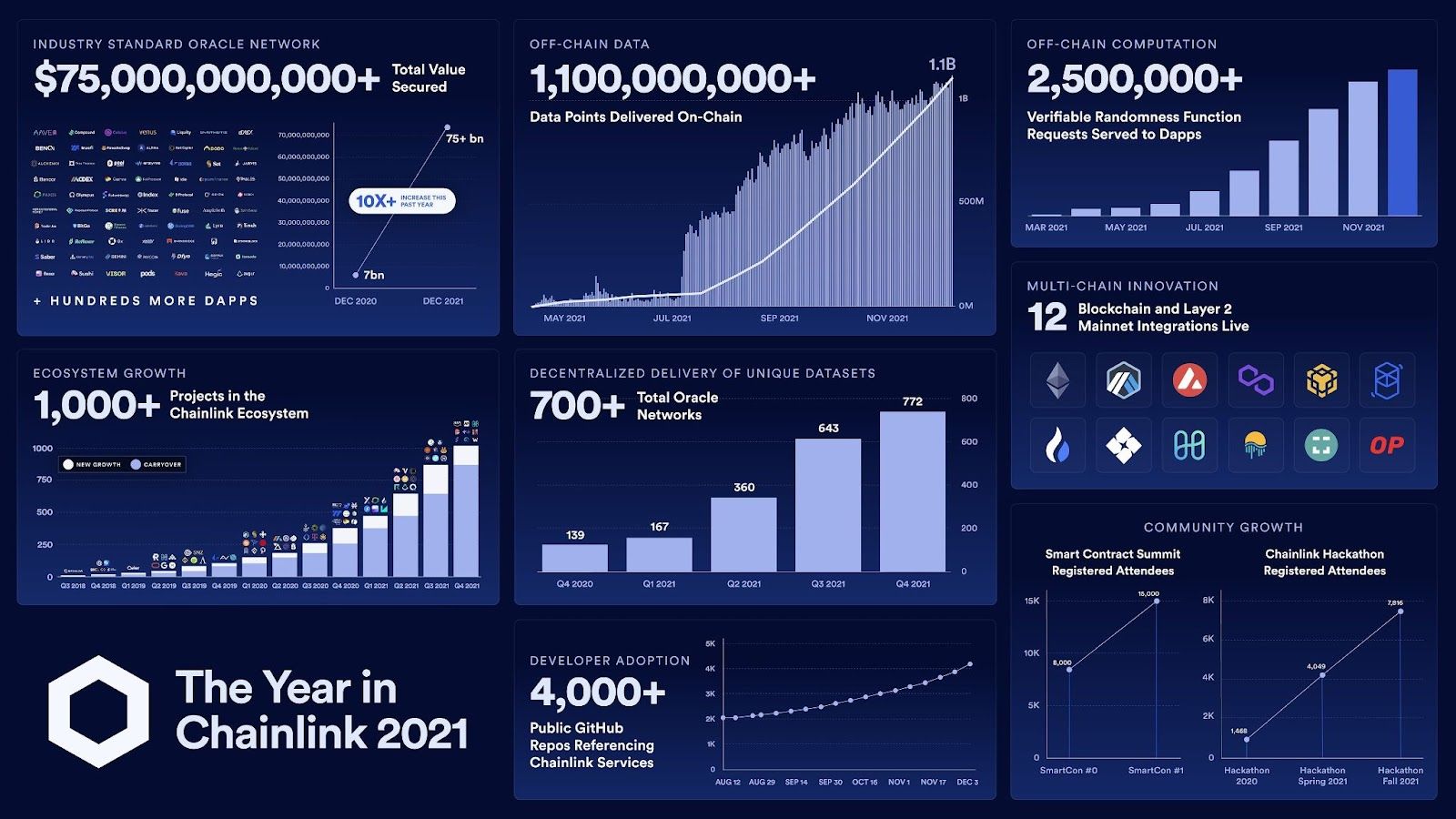 Theo báo cáo được công bố gần đây, 2021 là một năm kỷ lục đối với Chainlink. Mạng oracle phổ biến nhất này đã được tích hợp vào hơn 1,000 nền tảng/ ứng dụng, bảo đảm cho 75 tỷ TVS (tổng giá trị được bảo đảm) và cung cấp khả năng tính toán ngoài chuỗi an toàn thông qua việc sử dụng DON (Mạng Oracle phi tập trung).