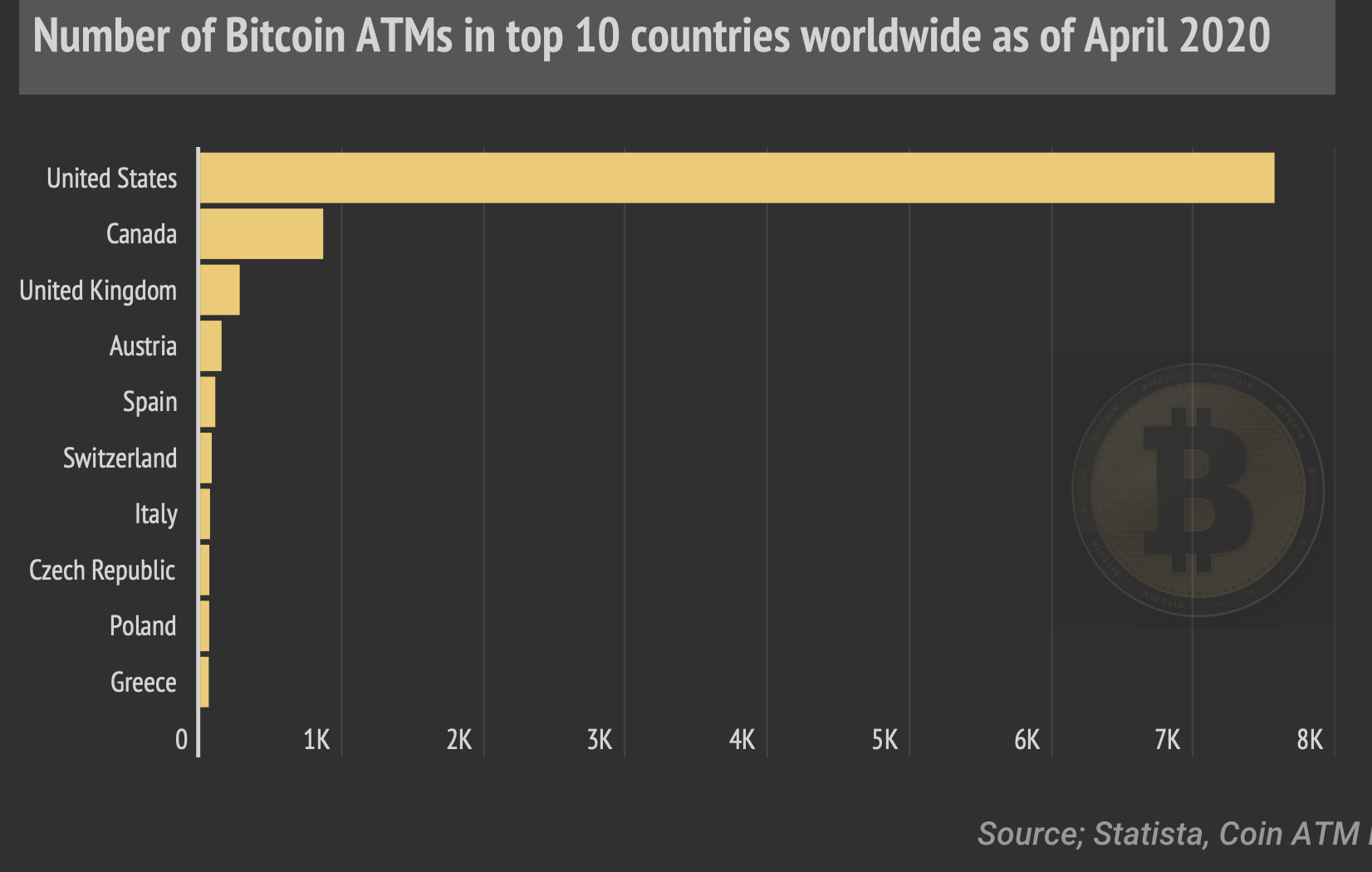 Canada xếp ở vị trí thứ 2 về số lượng máy ATM Bitcoin trên phạm vi toàn cầu. Quốc gia này hiện sở hữu 869 máy ATM Bitcoin. Các quốc gia còn lại trong top 10 đều nằm ở khu vực Châu Âu. Đó là các quốc gia: Anh, Bỉ, Tây Ban Nha, Thụy Sĩ, Italy, Công hòa Séc, Ba Lan và Hy Lạp.