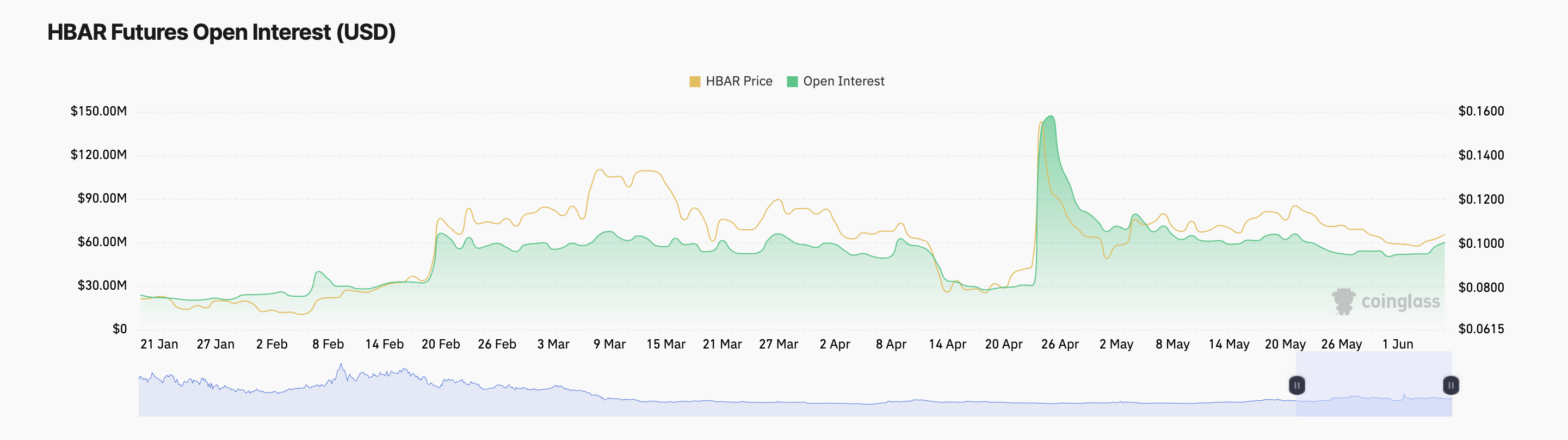 Mặc dù giá của Altcoin đã giảm trong vài tuần qua, hoạt động thị trường tương lai của nó vẫn tiếp tục tăng. Đầu tiên, open interest (OI) của nó đã có xu hướng tăng từ đầu tháng. Tính đến thời điểm hiện tại, OI hợp đồng tương lai của HBAR đã tăng 18% kể từ ngày 01/06, đạt 60 triệu USD.
