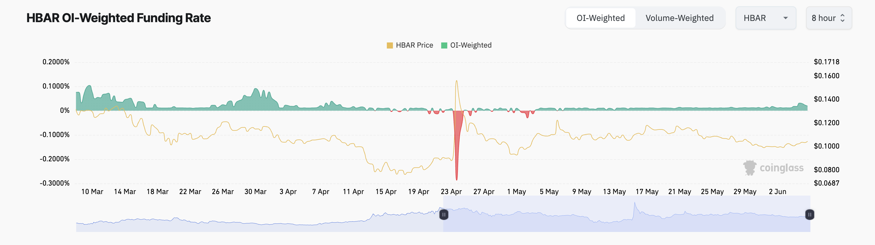 Bên cạnh việc tăng OI của HBAR, funding rate của nó trên các sàn giao dịch tiền điện tử vẫn duy trì tích cực. Xu hướng này đã bắt đầu từ ngày 03/05, khi Altcoin này ghi nhận funding rate dấu hiệu tiêu cực lần cuối.