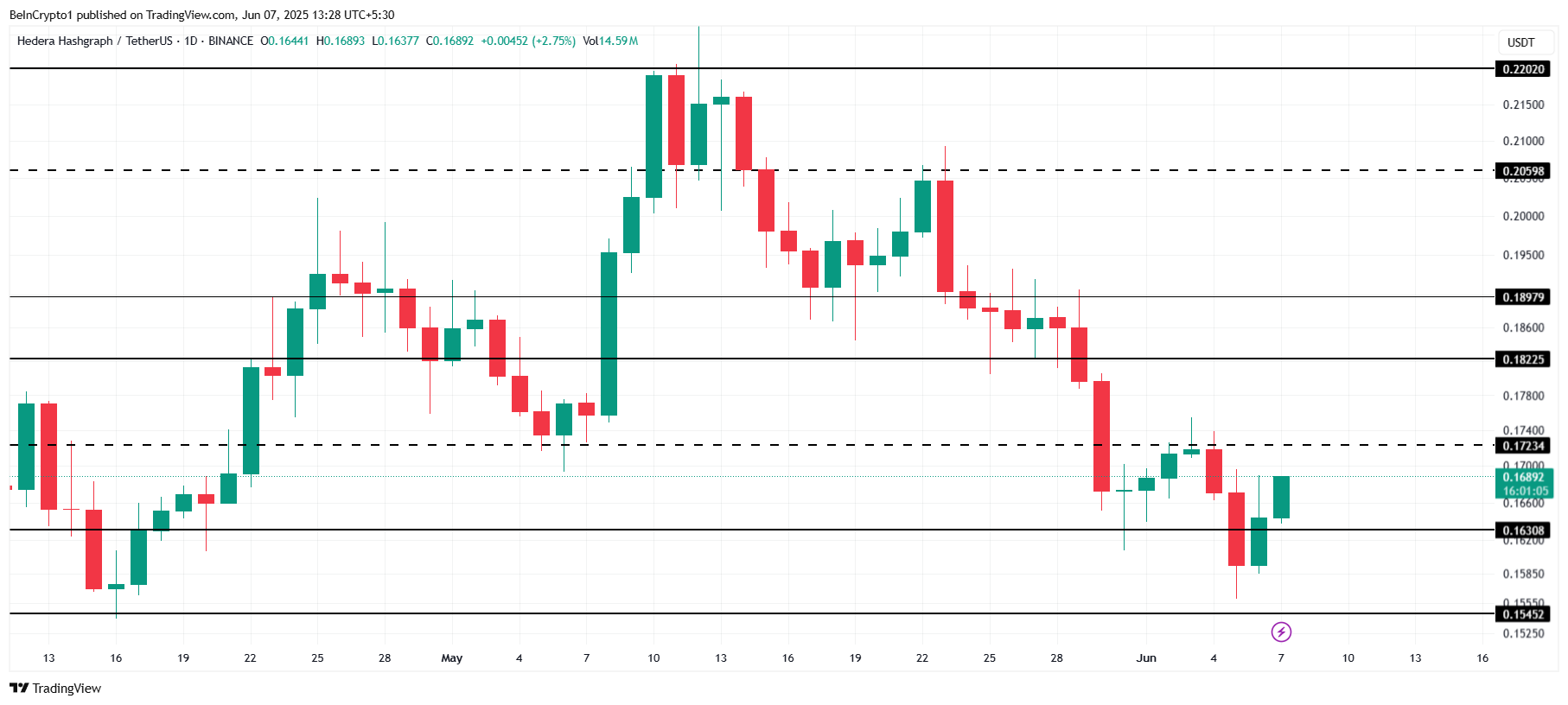Mức kháng cự tại 0.172 USD vẫn là một rào cản đáng kể cho HBAR, và nếu không vượt qua được mức này, giá có thể tiếp tục yếu đi.