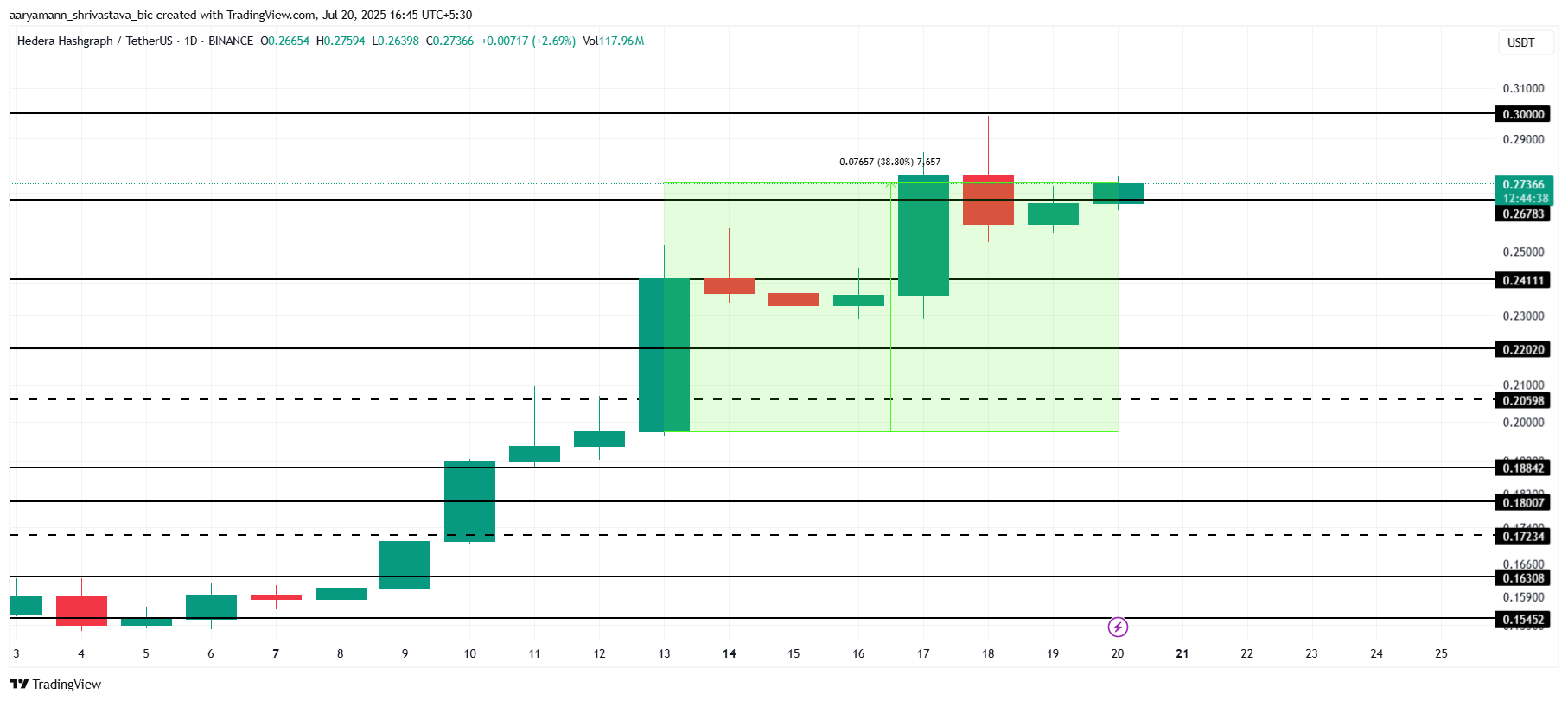 Giá HBAR đang trong xu hướng tăng mạnh, giao dịch ở mức 0.27 USD sau một tuần tăng trưởng ấn tượng. Với động lực tăng giá, altcoin này đang tiến gần đến mốc 0.30 USD, một mức giá chưa thấy trong năm tháng qua.