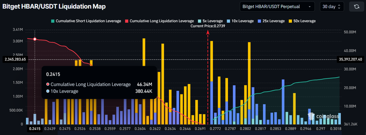 SponsoredNếu HBAR giảm xuống 0.24 USD, dữ liệu cho thấy có thể kích hoạt thanh lý dài lên đến 46 triệu USD. Điều này có thể dẫn đến gia tăng tổn thất khi các nhà giao dịch sử dụng đòn bẩy thoát khỏi vị thế của họ.