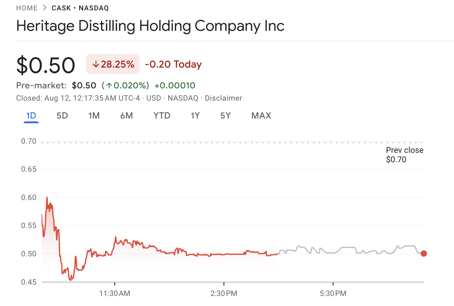 Dữ liệu từ Google Finance cho thấy giá đóng cửa của CASK là 0.5 USD, giảm 28.25%. Trong giao dịch trước giờ mở cửa, cổ phiếu của Heritage tăng nhẹ 0.020%.
