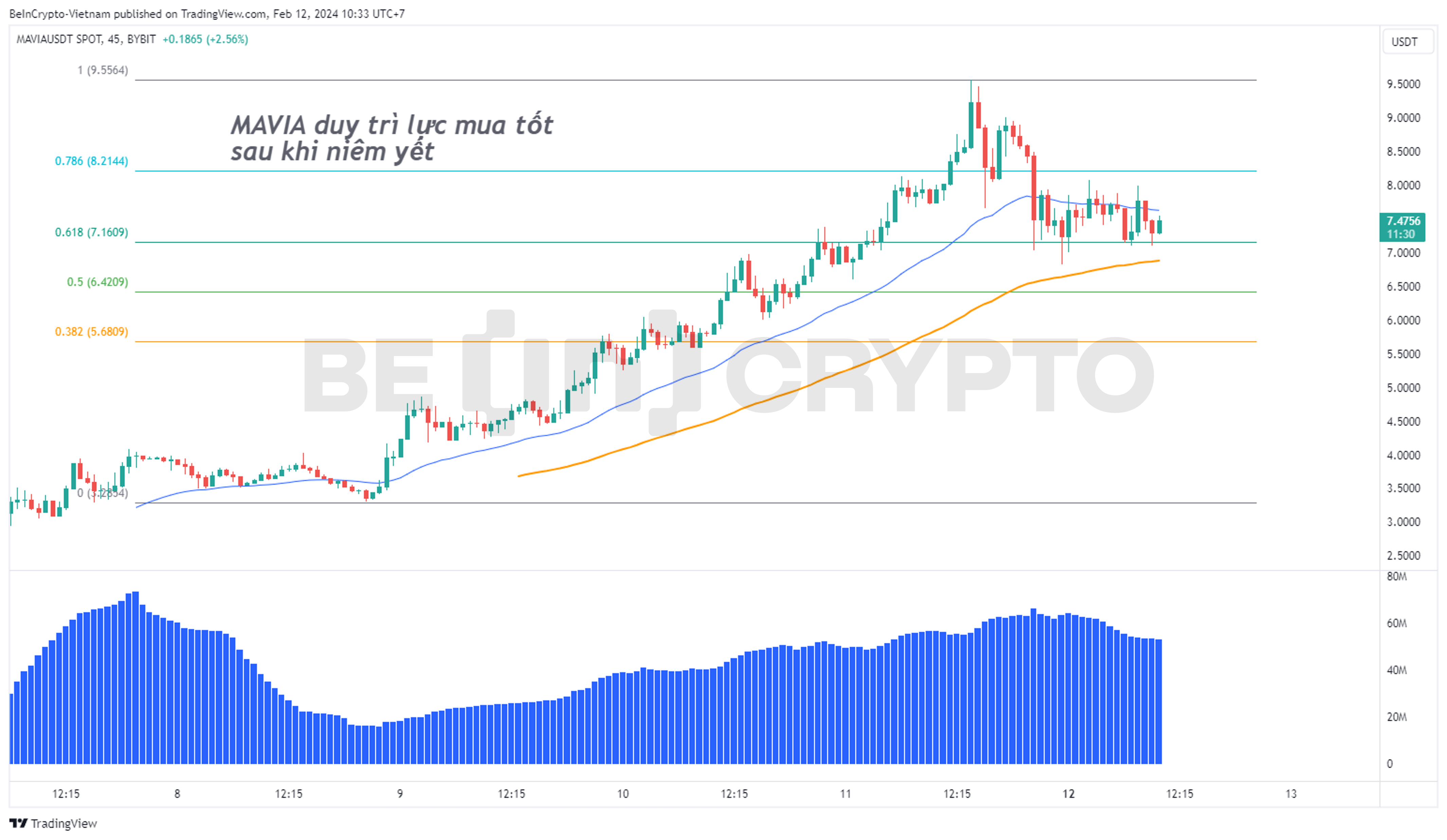 Khối lượng giao dịch này đi kèm với đà tăng gấp 5 lần cho thấy nhu cầu nắm giữ MAVIA trong bối cảnh hiện tại. Áp dụng thước đo fibonacci cho biến động giá, MAVIA đang ở hỗ trợ 7 USD và gợi ý vùng mua lại tốt 5.5 USD – 6.5 USD.