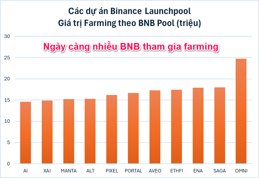 Tần suất các dự án trên Launchpool chưa khi nào dồn dập như năm 2024, tính trung bình cứ mỗi tháng thì có đến 3 dự án đưa lên Launchpool. Các BNB Holder sớm nhận thấy điều này, họ càng có thêm động lực để nắm giữ BNB tham gia staking. Số lượng BNB được staking ngày càng tăng, đặc biệt gần đây Omni Nework (OMNI) ghi nhận gần 25 triệu BNB được staking.
