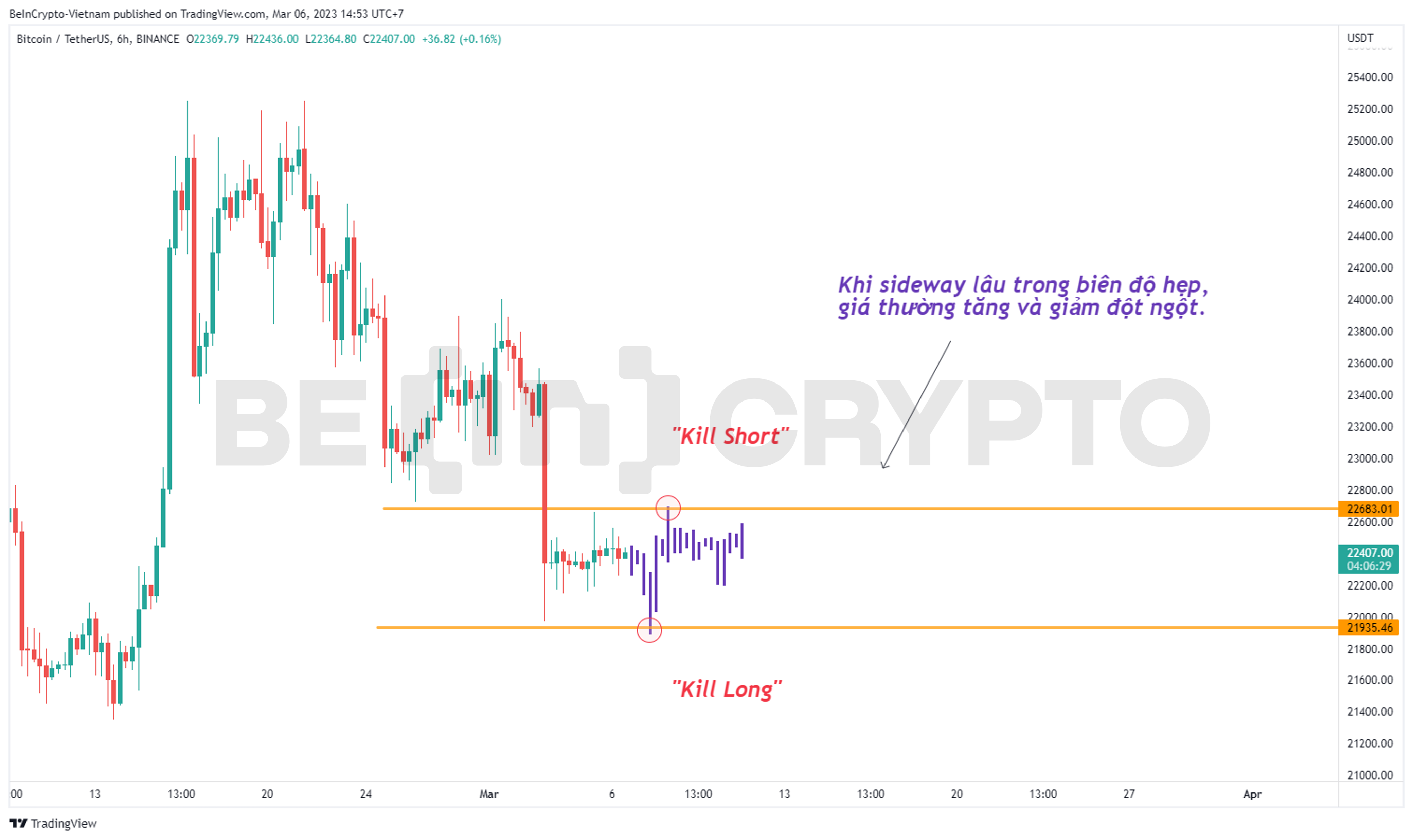- Khi đó, BTC dễ xuất hiện dạng biến động “quét” cả hai giới hạn trên và dưới, đủ để khiến cho các lệnh bị thanh lý. Nguyên nhân của dạng biến động này đến sự cân bằng thanh khoản giữa mua và bán. Điều đó làm cho những lệnh có khối lượng đột biến nhanh chóng được hấp thụ và triệt tiêu để cân bằng trở lại.