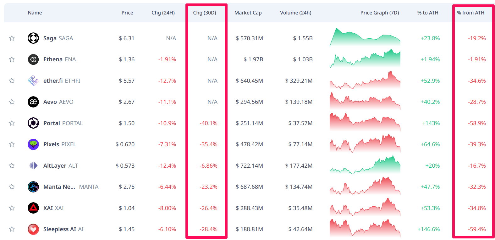 - Trong 30 ngày qua, các dự án này ghi nhận mức giảm từ -7% đến -40%, và nếu tính từ ATH thì đã giảm -16% đến gần -60%. Một vài dự án mới niêm yết như ENA, SAGA vẫn chưa đánh giá được, nhưng tình trạng chung đều cho thấy hiệu suất tăng trưởng kém, tăng nhanh rồi cũng giảm nhanh hoặc chỉ sideway trong một vùng giá nhất định.