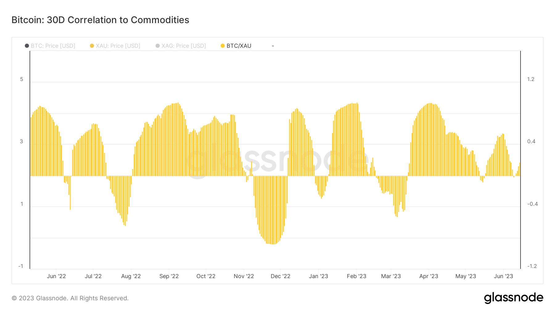 Trong những tháng gần đây, Bitcoin đã và đang cho thấy sự tách rời khỏi vàng ngày càng tăng. Theo dữ liệu của Glassnode, mối tương quan BTC/XAU đã giảm xuống 0.17 kể từ ngày 14/6. Đây là mức khá thấp so với mức cao nhất trong nhiều năm được thấy trong tháng 4. Điều đó có nghĩa là Bitcoin đang dần được xem như là một loại tài sản độc lập với các nguyên tắc cơ bản của riêng nó thay vì bị ảnh hưởng và chi phối bởi những cơn gió ngược trong thế giới thực.