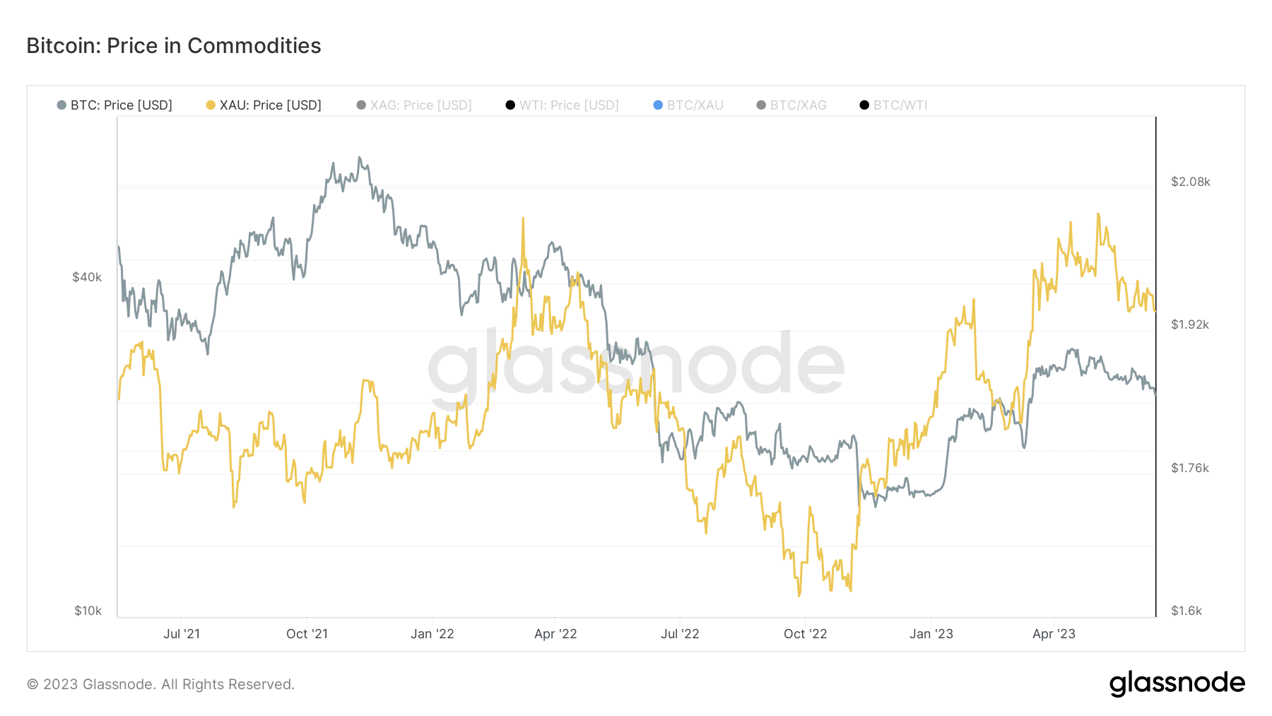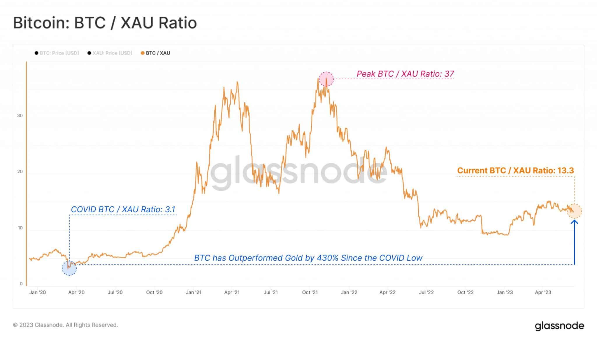 Vàng là một ví dụ điển hình cho sự so sánh này. Theo một tweet của Glassnode vào ngày 14/6, cần 13.3 ounce vàng để mua một Bitcoin, mức tăng đáng kể 46% kể từ đầu năm. Đương nhiên, tỷ lệ này vẫn còn khác xa so với thời điểm cao nhất (37) đạt được trong thị trường tăng giá năm 2021. Nhưng nếu chúng ta so sánh với mức thấp ở thời điểm đại dịch Covid-19 xảy ra thì nó lại ghi nhận mức tăng trưởng đến 430%.
