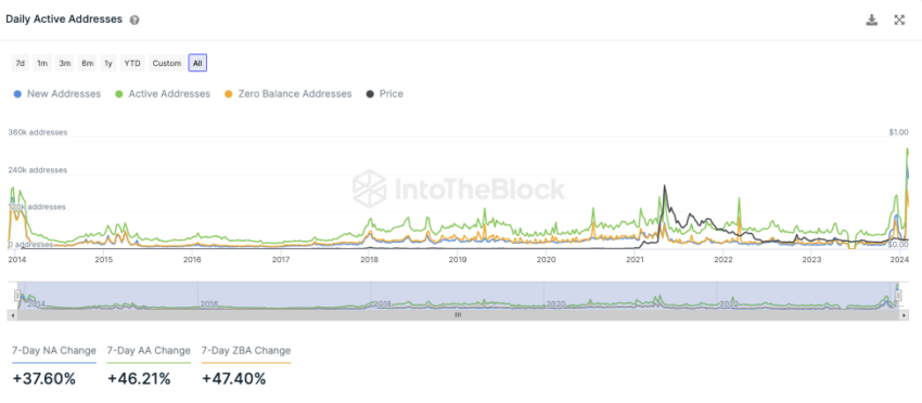 Trong tuần qua, Dogecoin đã chứng kiến sự gia tăng đáng kể trong hoạt động mạng. Số lượng địa chỉ DOGE đang hoạt động đã tăng ấn tượng hơn 46%. Ngoài ra, việc tạo địa chỉ DOGE mới đã tăng khoảng 38%.