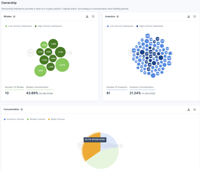 Cơ cấu quyền sở hữu của Dogecoin cho thấy sự tập trung đáng kể giữa các nhà đầu tư lớn và địa chỉ các ví cá voi. Do đó, khoảng 81 nhà đầu tư lớn, mỗi nhà đầu tư nắm giữ từ 0.1% đến 1% số lượng đồng coin Dogecoin, nâng tổng sở hữu lên khoảng 21.3% tổng nguồn cung. Hơn nữa, có 10 địa chỉ cá voi, mỗi địa chỉ sở hữu hơn 1% tổng khối lượng Dogecoin, chiếm gần 44% số lượng nắm giữ.