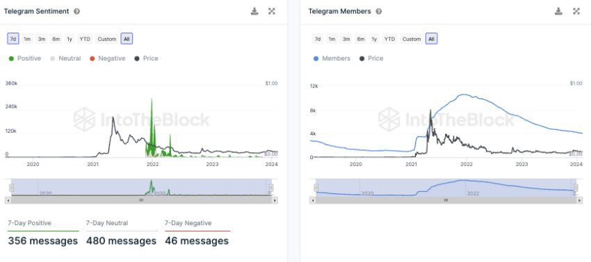 Tin tức tích cực về Dogecoin trên Telegram lớn hơn đáng kể so với tin tức tiêu cực, với gần 356 câu chuyện tích cực trong bảy ngày qua so với 46 câu chuyện tiêu cực. Số liệu này cho chúng ta thấy tâm lý lạc quan chủ yếu đối với Dogecoin trong cộng đồng những nhà đầu tư tiền điện tử.