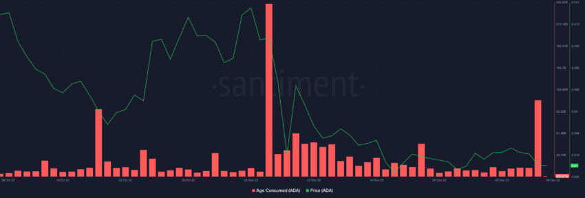Khi những người nắm giữ nhận ra mình bị thua lỗ, rất nhiều đồng ADA lâu năm đã được di chuyển. Chỉ báo Age Consumed cho Cardano cho thấy hơn 107 tỷ ADA đã được di chuyển vào ngày 07/12.