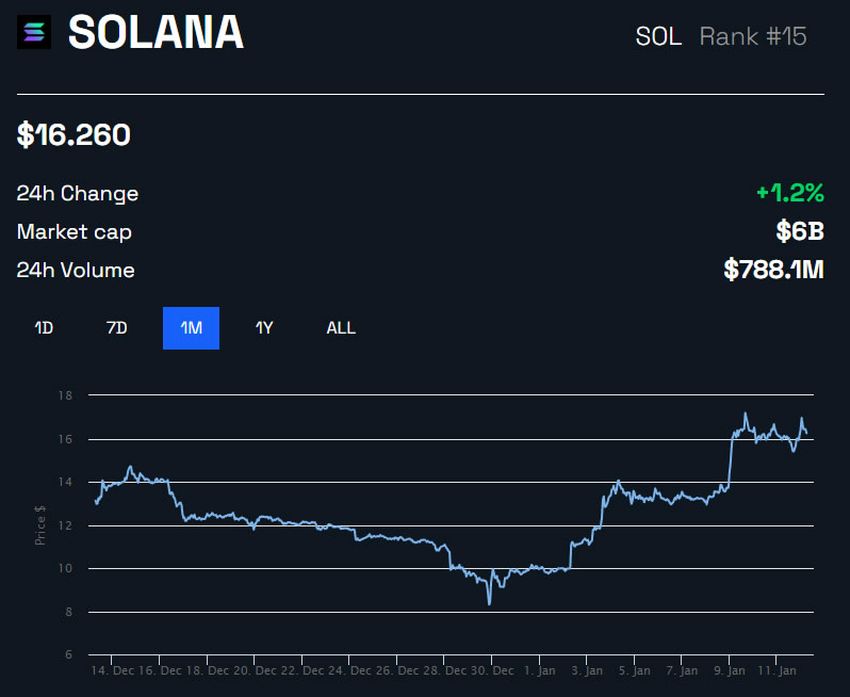 Giá SOL tăng hơn 1% trong ngày để giao dịch ở mức 16.26 USD tại thời điểm BeInCrypto viết bài. Tuy nhiên, SOL đã thất bại trong việc giữ đà tăng dần đều này vào ngày 09/1. SOL đóng cửa ở mức 17 USD vào sáng sớm thứ 5 nhưng không thể vượt qua ngưỡng kháng cự ở đó.