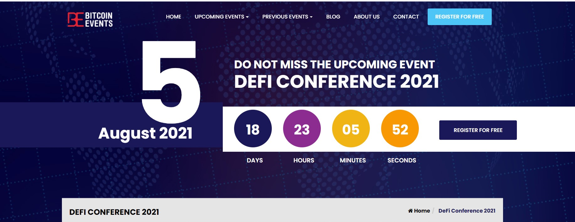 Mới đây, trang chuyên tổ chức sự kiện bitcoinevents cập nhật một thông báo mới. Hội nghị DeFi thường niên lần thứ hai dự kiến sẽ diễn ra trực tuyến vào ngày 5 tháng 8 năm 2021.