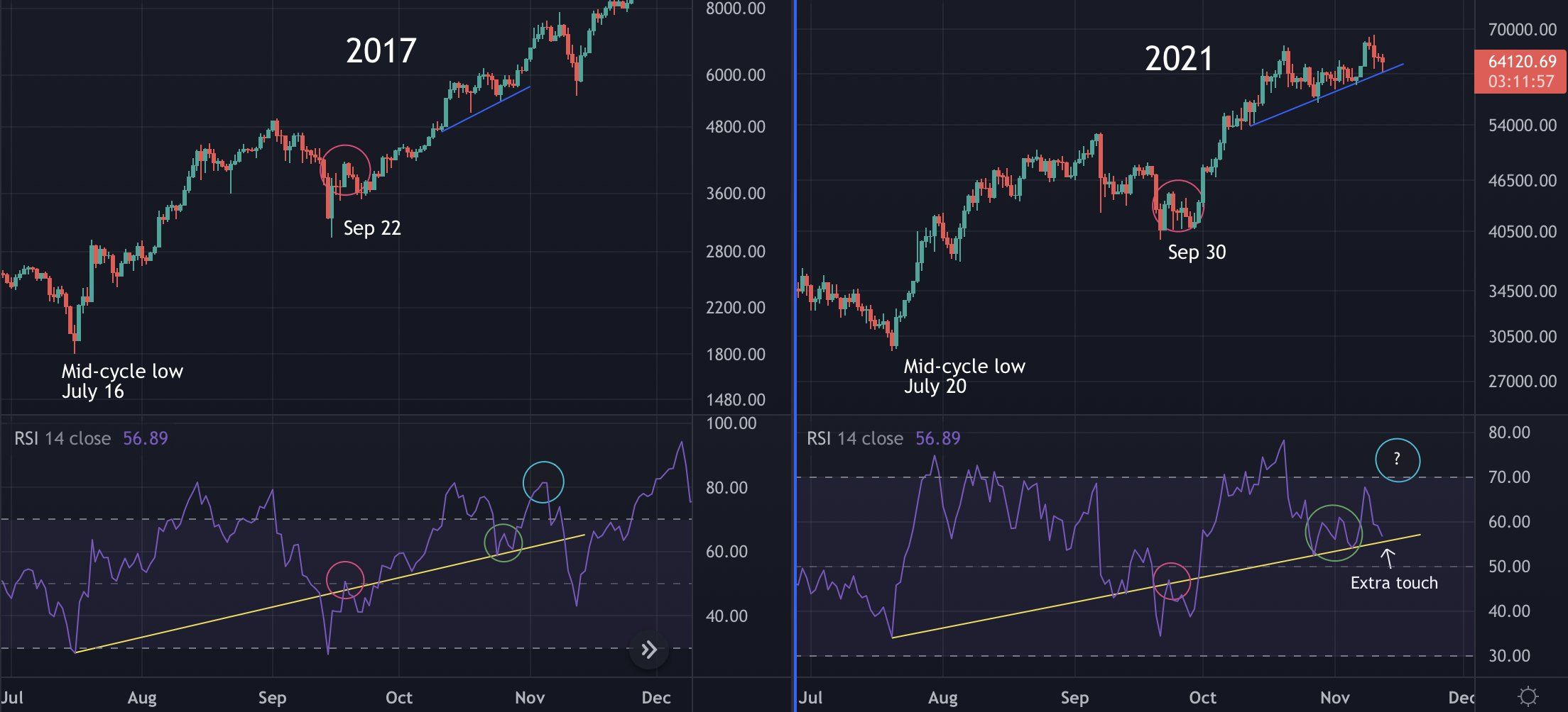 Techdev đã chỉ ra điểm tương đồng trong biến động RSI của năm 2017 và 2021 khi Bitcoin bước vào đà tăng giá.