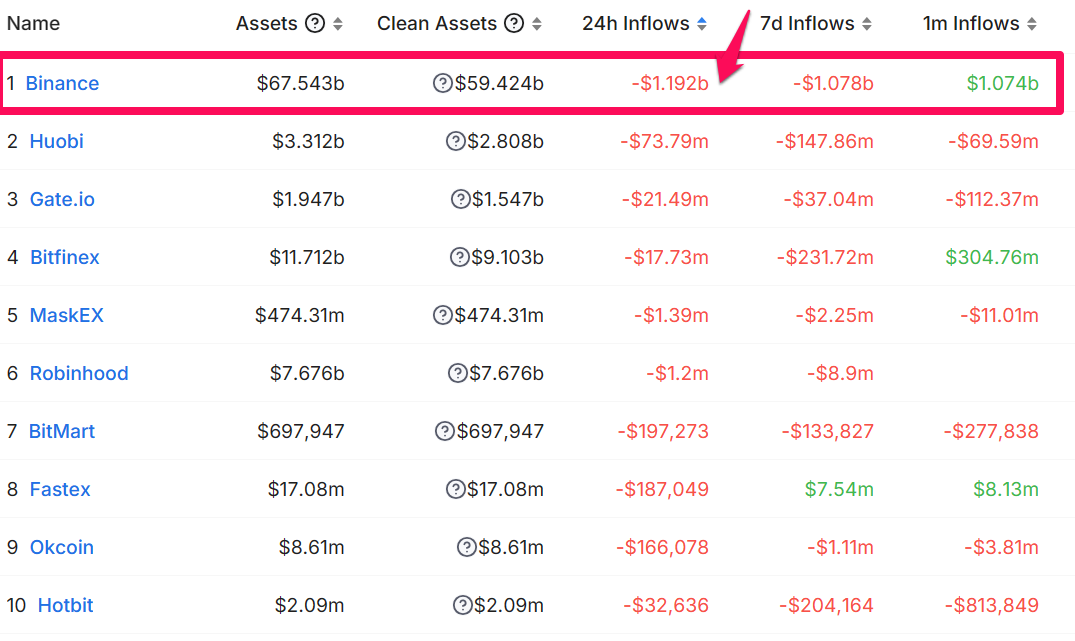 Theo dữ liệu CEX Transparency từ Defillama, thì sàn Binance dẫn đầu về khối lượng Inflow âm trong 24h qua. (Lưu ý: Khối lượng Inflow âm có nghĩa là nhà đầu tư rút tiền nhiều hơn nạp tiền). Bất kể điều này đang diễn ra, Binance vẫn là sàn giao dịch có tài sản nắm giữ hàng đầu thị trường.