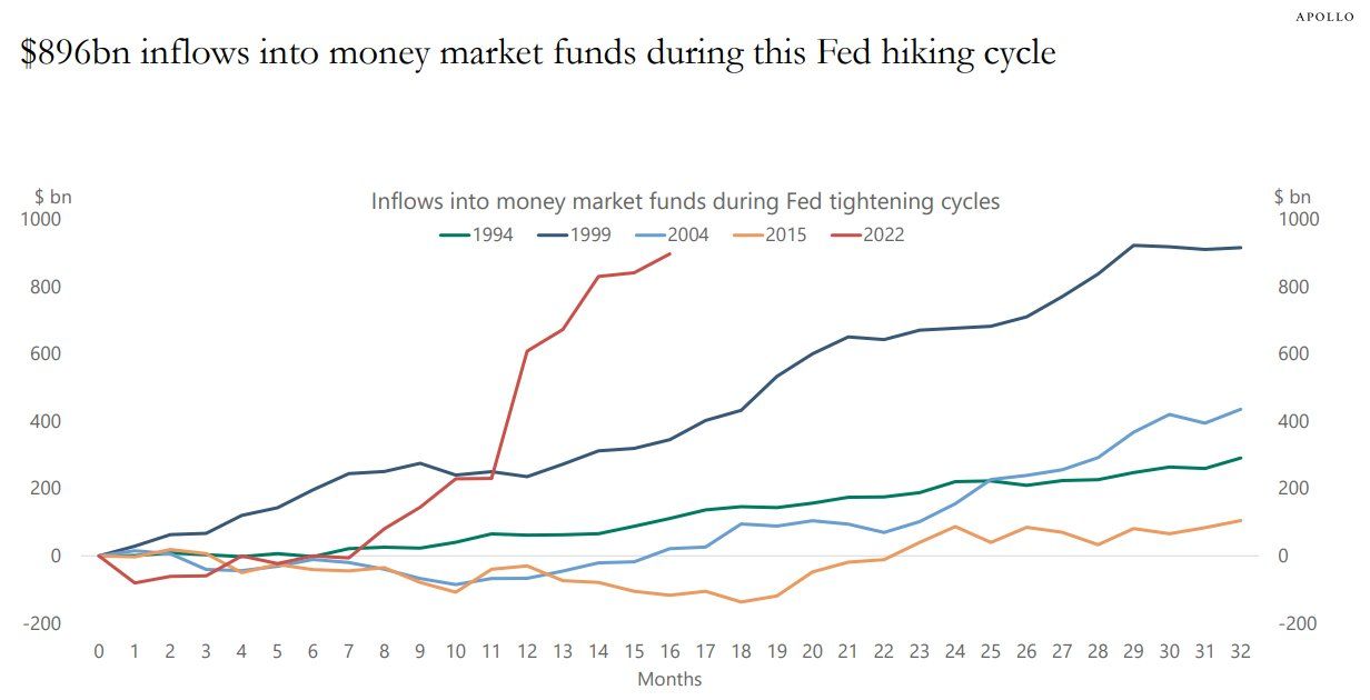 Kể từ năm 2022 đến nay, dữ liệu từ @KobeissiLetter ghi nhận có 896 tỷ USD chảy vào quỹ thị trường tiền tệ. Trong những chu kỳ thắt chặt trước như 1994, 1999, 2004, 2015 đều ghi nhận sự gia tăng lượng inflow vào quỹ thị trường tiền tệ, nhưng chưa có chu kỳ nào lượng tiền đổ vào MMF lại nhanh chóng và ồ ạt như giai đoạn hiện nay.