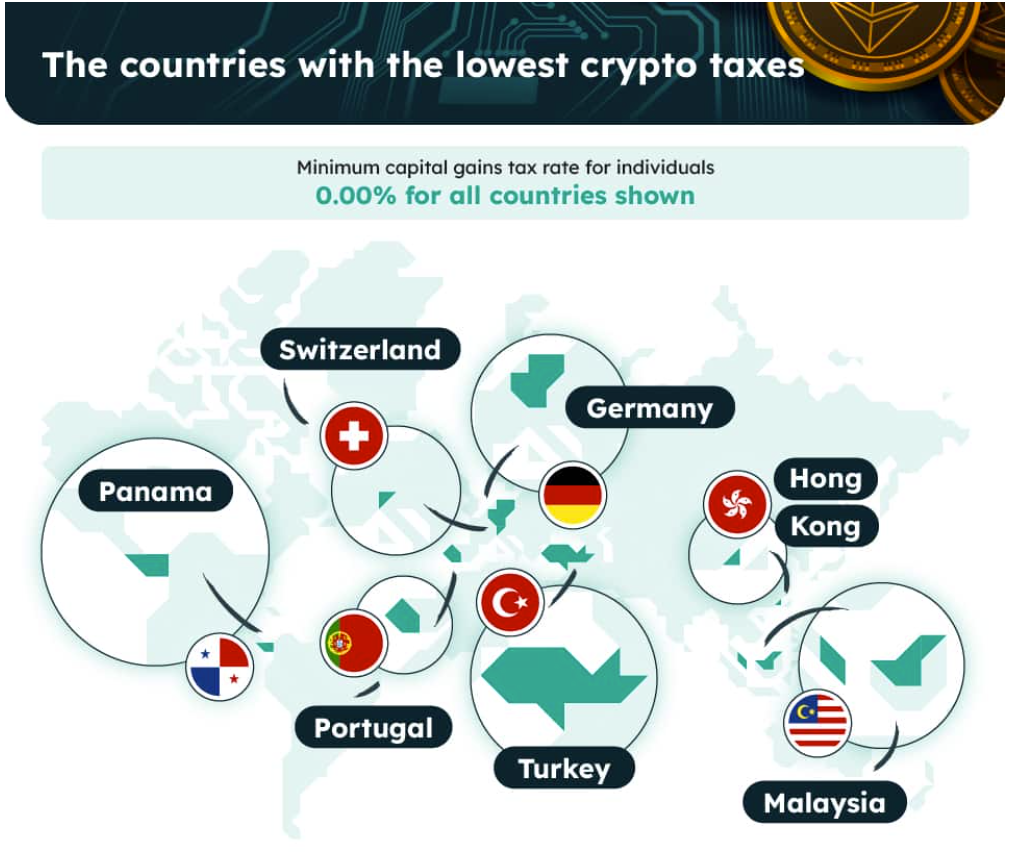 Theo báo cáo, Panama, Bồ Đào Nha, Đức, Malaysia và Thổ Nhĩ Kỳ cũng là các quốc gia miễn thuế như Hồng Kông, Thụy sĩ. Trong đó, Bồ Đào Nha và Panama không coi tiền điện tử là tiền tệ hợp pháp nên không áp dụng thuế. Malaysia miễn thuế cho các nhà đầu tư tư nhân nhưng sẽ thu thuế nếu là thu nhập thường xuyên. Đối với Thổ Nhĩ Kỳ, chính phủ không có quy định thu thuế với nhà đầu tư tiền điện tử. Nhưng doanh nghiệp kinh doanh tiền điện tử phải trả thuế 20%.
