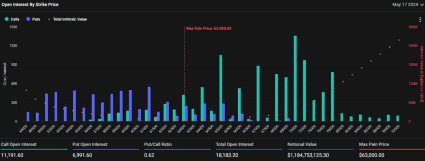 Hơn nữa, dữ liệu cho thấy điểm max pain của Bitcoin là 63,000 USD. Điểm max pain là giá mà tài sản sẽ gây ra tổn thất tài chính cho số lượng người nắm giữ lớn nhất.