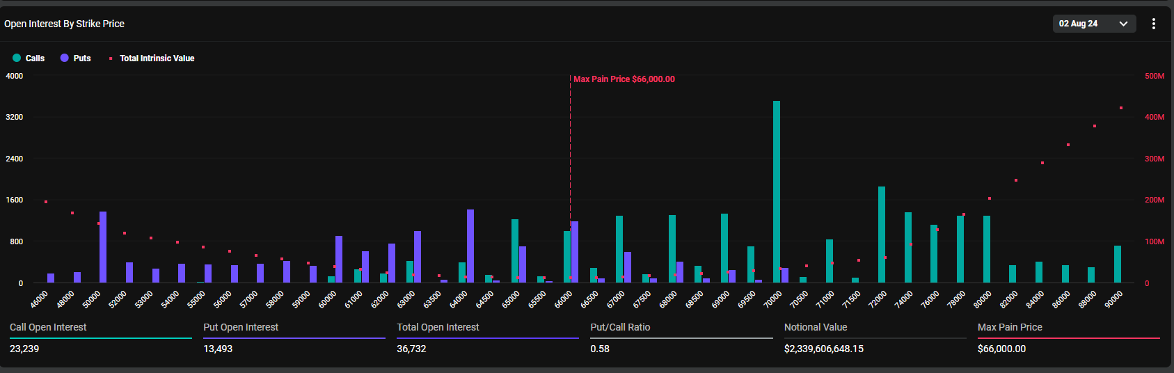 Theo dữ liệu từ Deribit, khoảng 2.34 tỷ USD gía trị hợp đồng quyền chọn Bitcoin (Bitcoin options) sẽ hết hạn hôm nay. Điểm max pain cho những options này là 66,000 USD, đi kèm với tỷ lệ Put to Call là 0.58. Đợt hết hạn này bao gồm 36,732 hợp đồng, ít hơn đáng kể so với 61,320 hợp đồng của tuần trước.