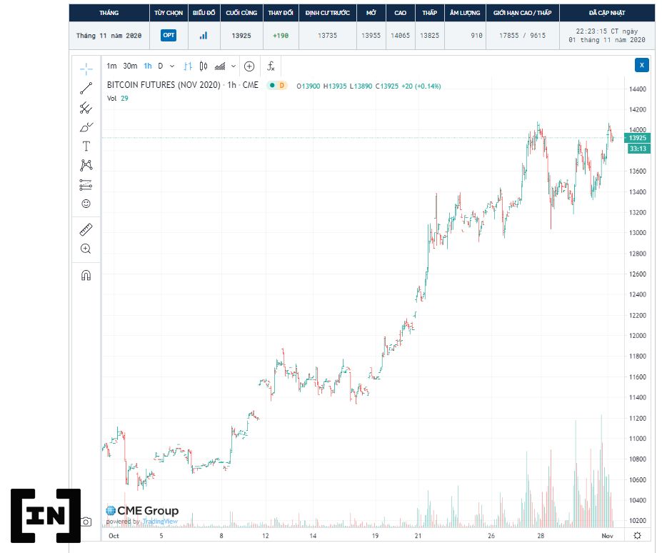 Hợp đồng tương lai BTC trên CME chốt giá 13,735 USD. Đây là con số khá an toàn cho những biến động sắp tới. Một phần khác, giá ghi nhận vào 1/11 là 13,781 USD.