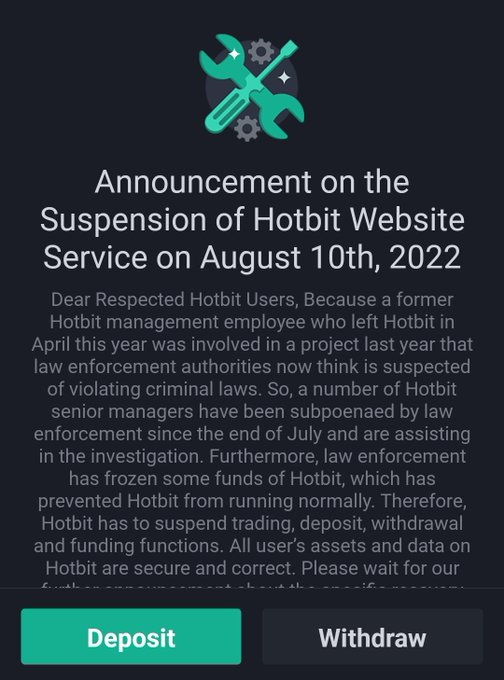 Tối ngày 10/8, sàn giao dịch Hotbit tuyên bố ngừng tính năng giao dịch gửi/tiền và cấp vốn. Sàn giao dịch cũng không tiết lộ khi nào sẽ mở lại những tính năng này. Theo báo cáo, nguyên nhân đến từ một quản lý đã rời Hotbit vào tháng 4/2022 và tham gia vào một dự án có hành vi phạm pháp. Sau đó, cơ quan thực thi pháp luật đã nghi ngờ có liên quan đến hành vi luật hình sự nên đã kiện Hotbit vào cuối tháng 7.
