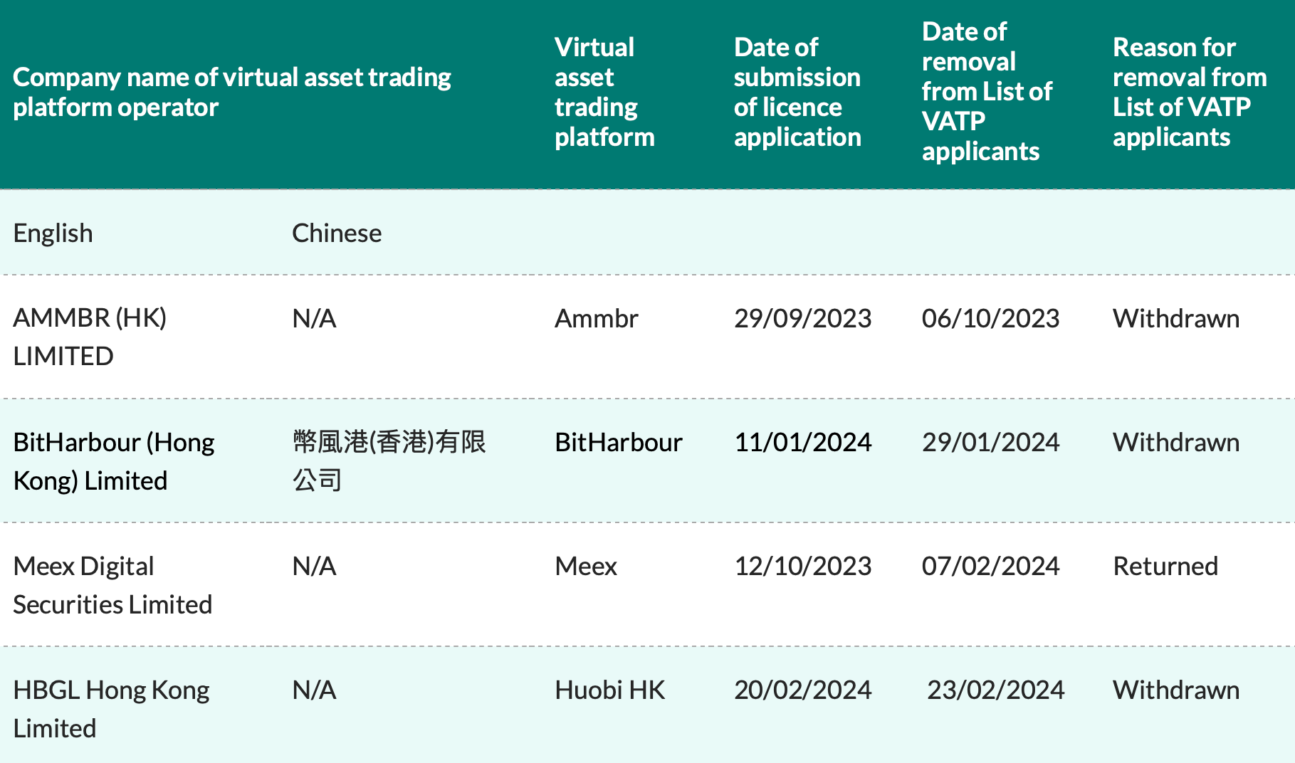 Trang web của SFC chỉ ra rằng Huobi HK đã rút đơn đăng ký giấy phép tại Hồng Kông chỉ ba ngày sau khi nộp đơn vào ngày 23/2.
