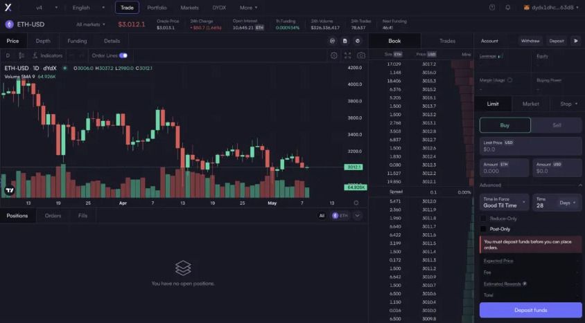 Sau khi kết nối, bạn có thể khám phá giao diện của sàn dYdX: