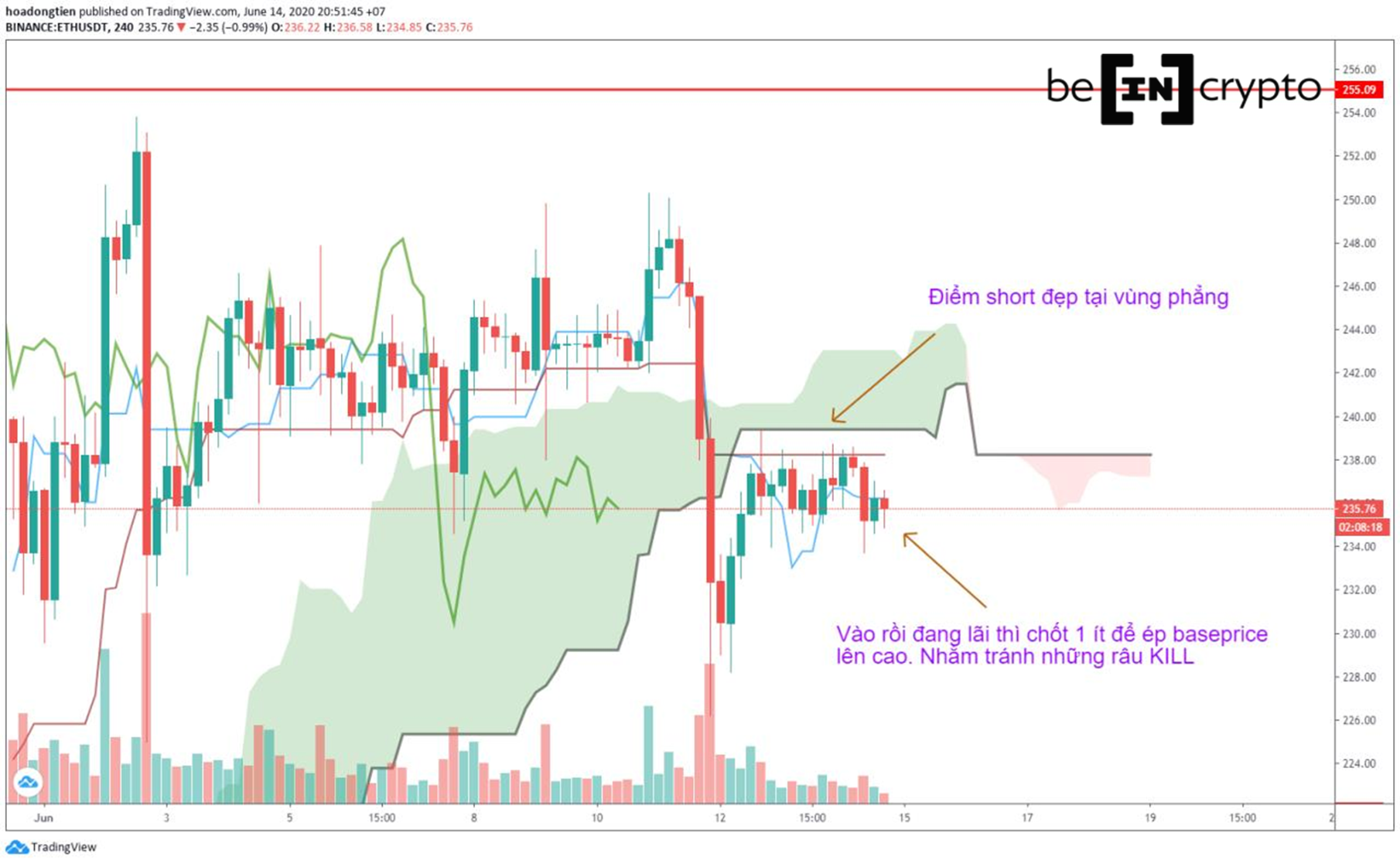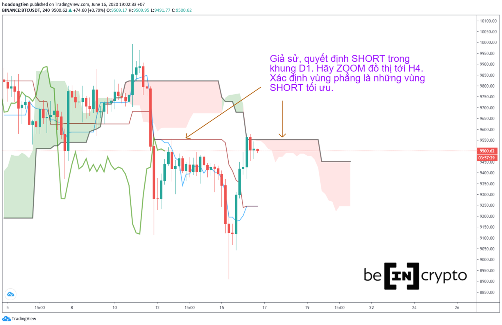 Giả sử bạn giao dịch trong khung D1, và tìm thấy một sự giao cắt giữa Tenkan và Kijun. Bạn muốn lên kế hoạch giao dịch. Thì đừng vội mua hay vội bán với mức giá hiện tại. Mà hãy soi đồ thị giá trong khung giờ nhỏ hơn.
