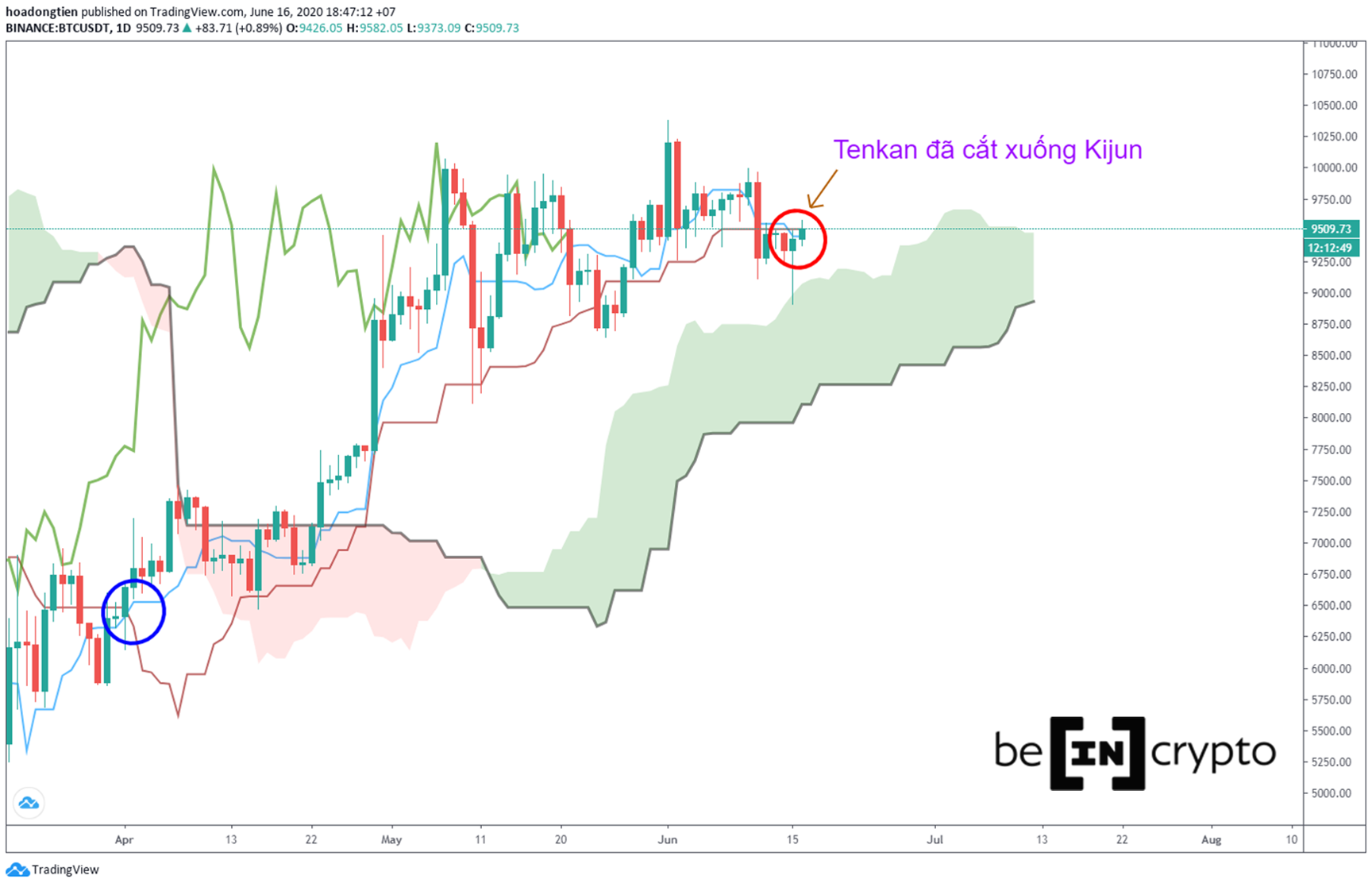 Có thể lấy ví dụ minh họa cho điều này bằng biến động gần đây nhất của Bitcoin. Bạn có thể thấy trong khung D1, đường Tenkan đã cắt xuống Kijun, đánh dấu cho một sự suy giảm được xác nhận.
