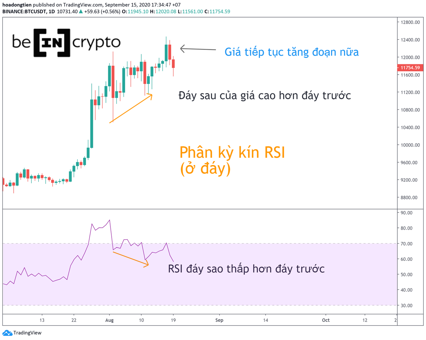 Phân kỳ kín RSI là khi RSI đạt một giá thị thấp hơn nhưng giá tương ứng lại đạt một giá trị cao hơn. Chúng ta sẽ xem xét cụ thể điều này trong hai trường hợp sau.