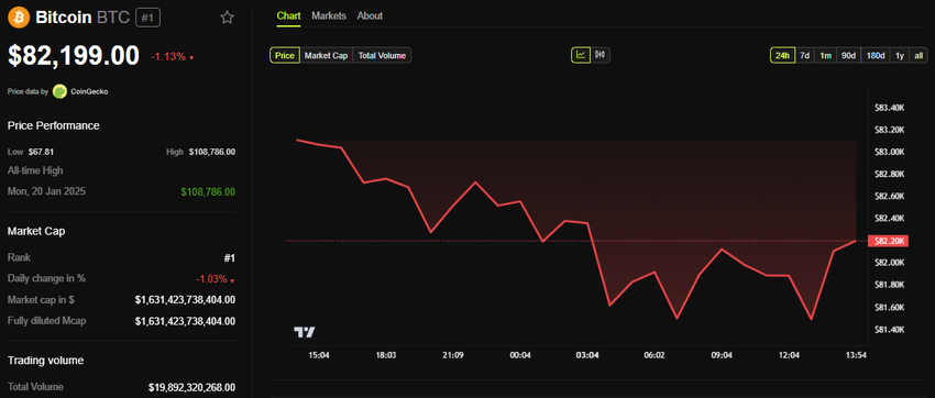 Dữ liệu từ BeInCrypto cho thấy BTC đang được giao dịch với giá 82,199 USD tại thời điểm viết bài. Nó đã giảm hơn 1.13% trong 24 giờ qua, không bị ảnh hưởng bởi tin tức về American Bitcoin. Tuy nhiên, điều này có thể thay đổi khi thị trường Mỹ mở cửa.
