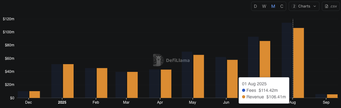 Theo DefiLlama, chỉ riêng trong tháng 08, doanh thu và phí của Hyperliquid đã đạt 106 triệu USD và 114 triệu USD. Những con số này cao hơn so với 86 triệu USD và 93 triệu USD của tháng 07. Trong tháng 07, Hyperliquid chiếm tới 35% tổng doanh thu trong toàn bộ ngành blockchain.