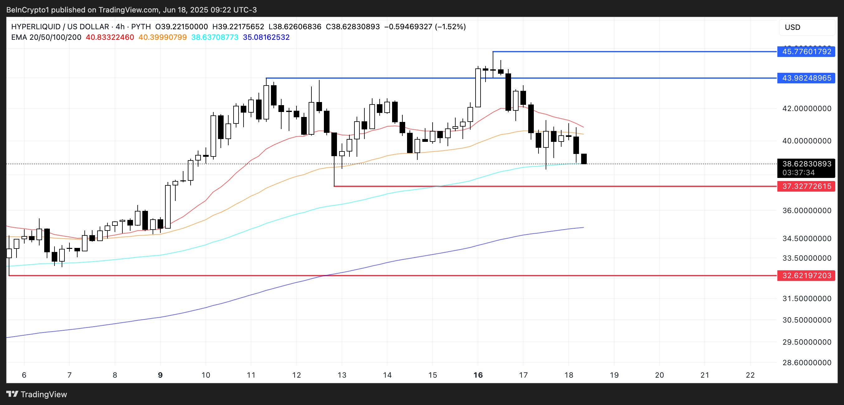 Nếu sự giao cắt giảm giá này được xác nhận, HYPE có thể kiểm tra mức hỗ trợ quan trọng tại 37.32 USD, và nếu phá vỡ dưới mức đó có thể dẫn đến giảm giá thêm về mức 32.62 USD.
