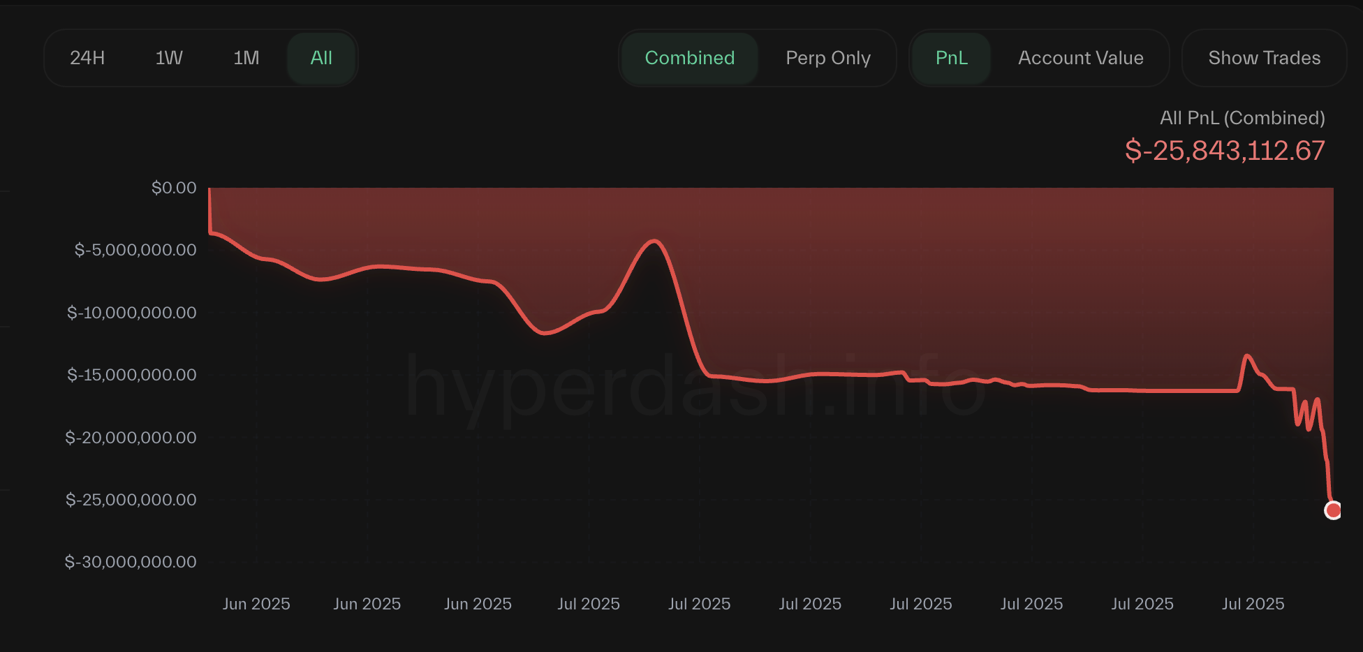 Trong số những người chịu tổn thất là trader Qwatio, một cá voi trên Hyperliquid, người có các vị thế short mạnh mẽ đã gần như xóa sạch lợi nhuận của anh ta, để lại một khoản lỗ đáng kinh ngạc là 25.8 triệu USD.