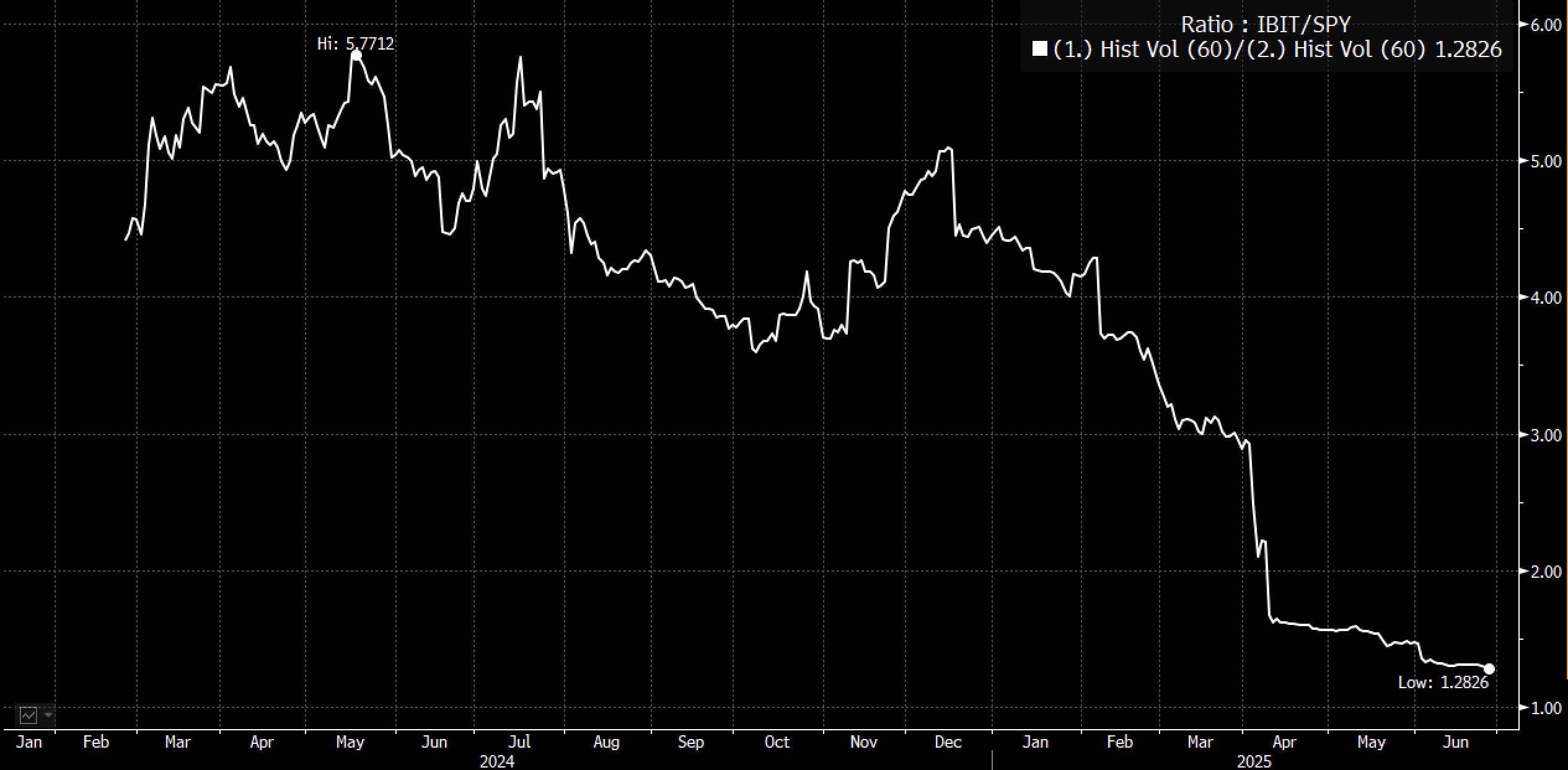 Tuy nhiên, IBIT và IVV có điểm tương đồng khác, vì quỹ ETF BTC gần như biến động như S&P 500. Độ biến động của IBIT đã giảm cùng với Bitcoin, gây lo ngại về khả năng thành công đột phá của tiền điện tử trong tương lai.