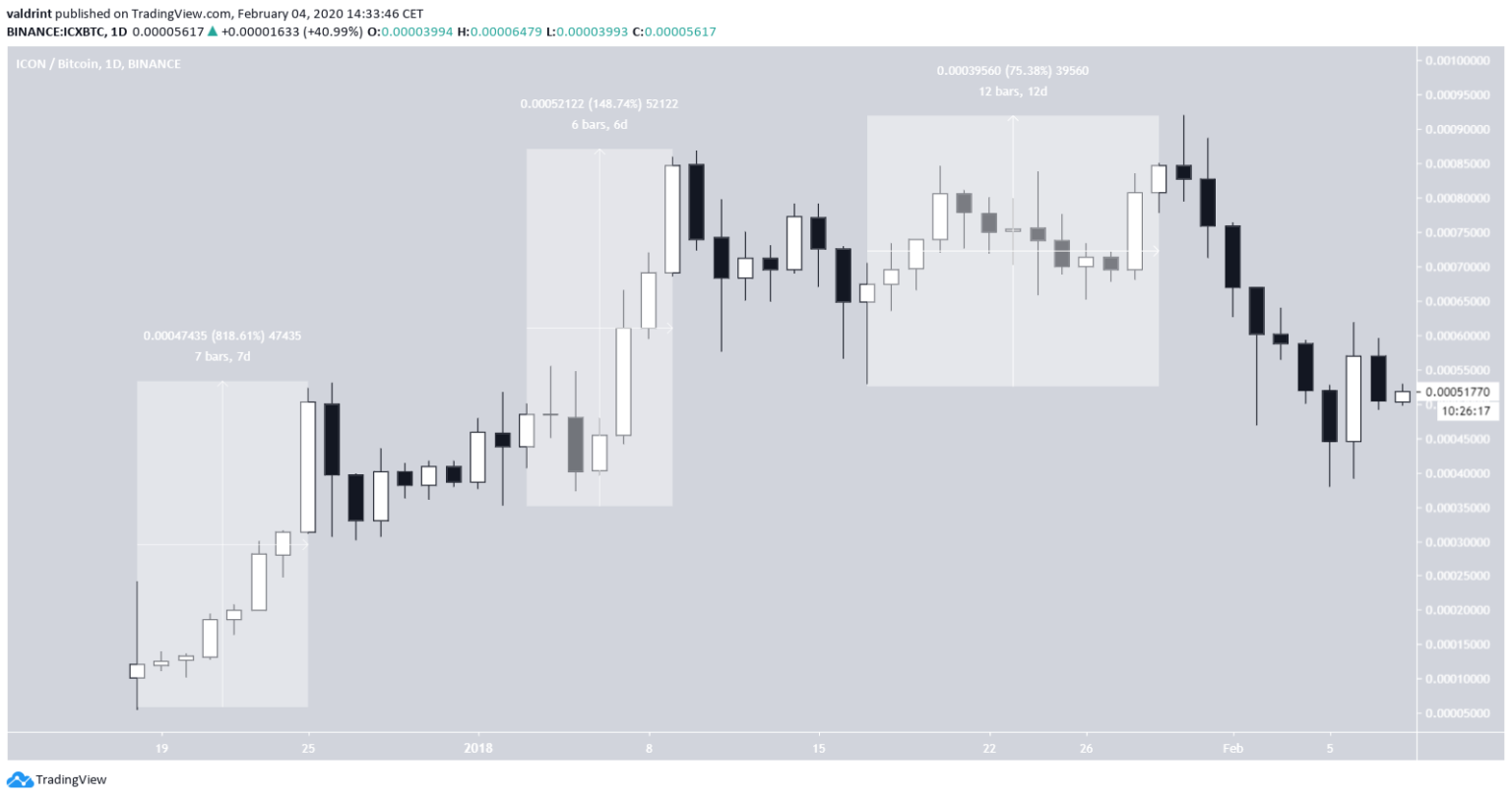 Trong giai đoạn 2017/2018, giá ICX đã ghi nhận 3 đợt vận động theo xu hướng đi lên. Các đợt này kéo dài lần lượt là 7, 6 và 12 ngày.