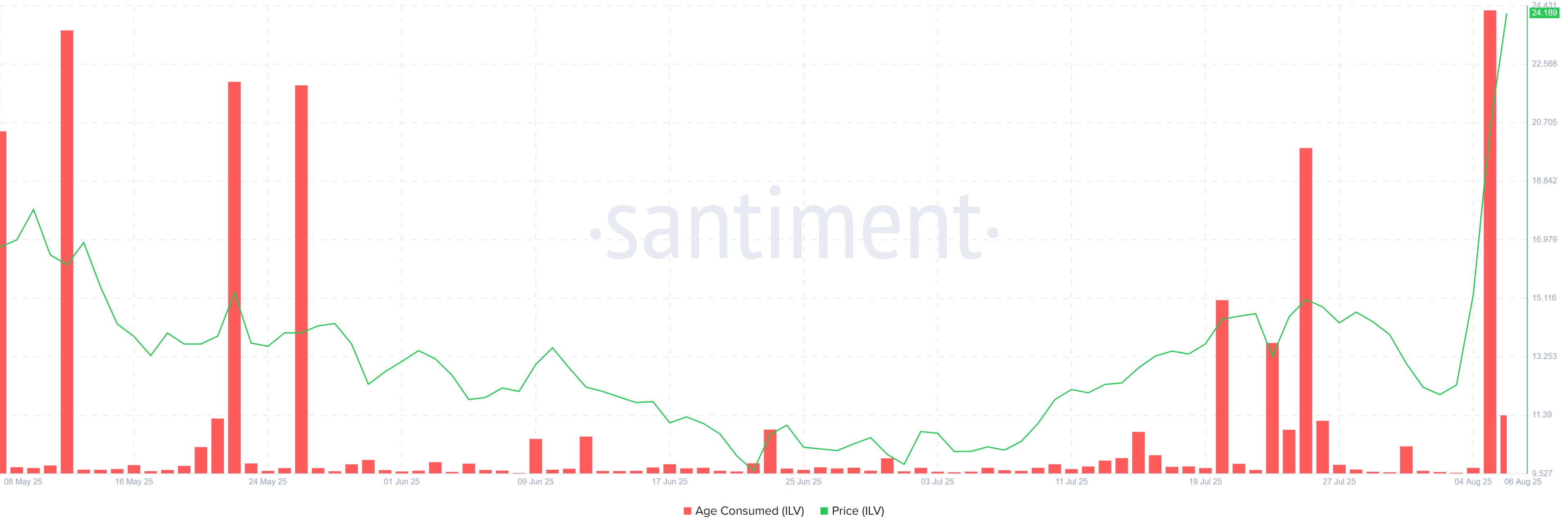 Giá ILV đã tăng gần 60% trong 24 giờ qua, hiện đang giao dịch ở mức 24.41 USD. Altcoin đã vượt qua ngưỡng kháng cự 24.19 USD và đang đối mặt với rào cản 27.01 USD.