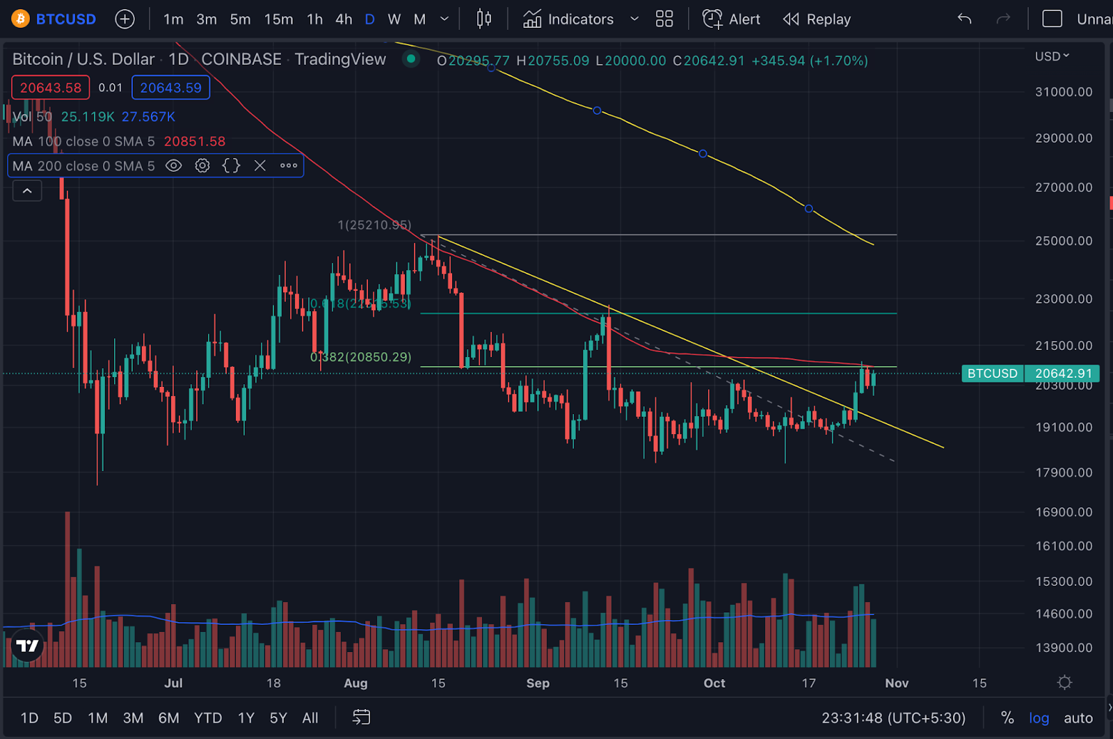 Mức kháng cự chính tiếp theo là ở mức Fib 0.618 ở khoảng 22,500 USD. Khu vực này cũng là đỉnh của tháng Chín.
