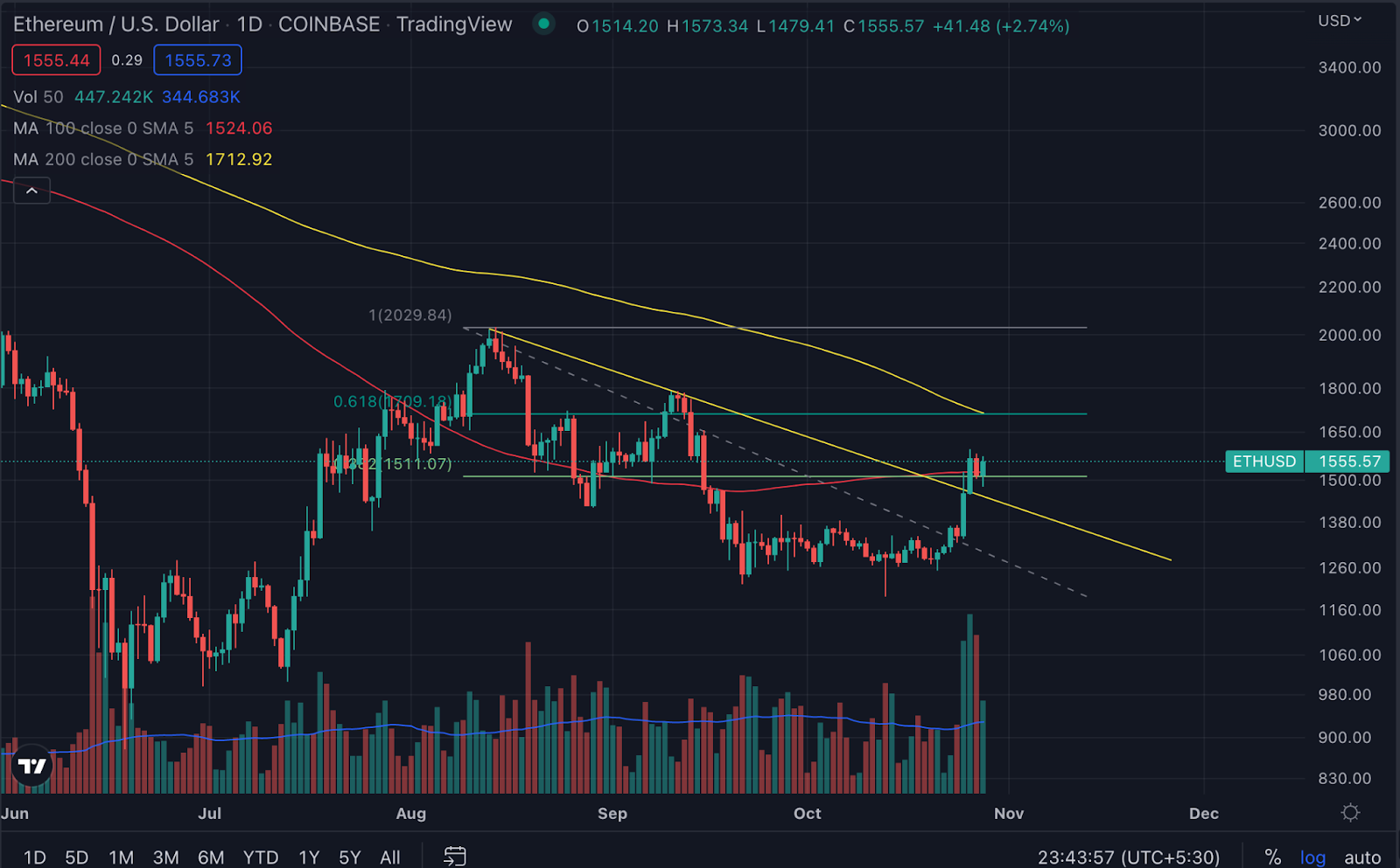 Hiện tại, có các mức kháng cự chính quanh vùng 1,700 USD – 1.800 USD. Khu vực này có mức thoái lui Fib 0.618 và mức kháng cự của mức cao nhất trong tháng 9. Mức kháng cự chính là SMA 200 ngày. Ethereum đã không kiểm tra lại đường SMA 200 ngày kể từ tháng 4 năm 2022.