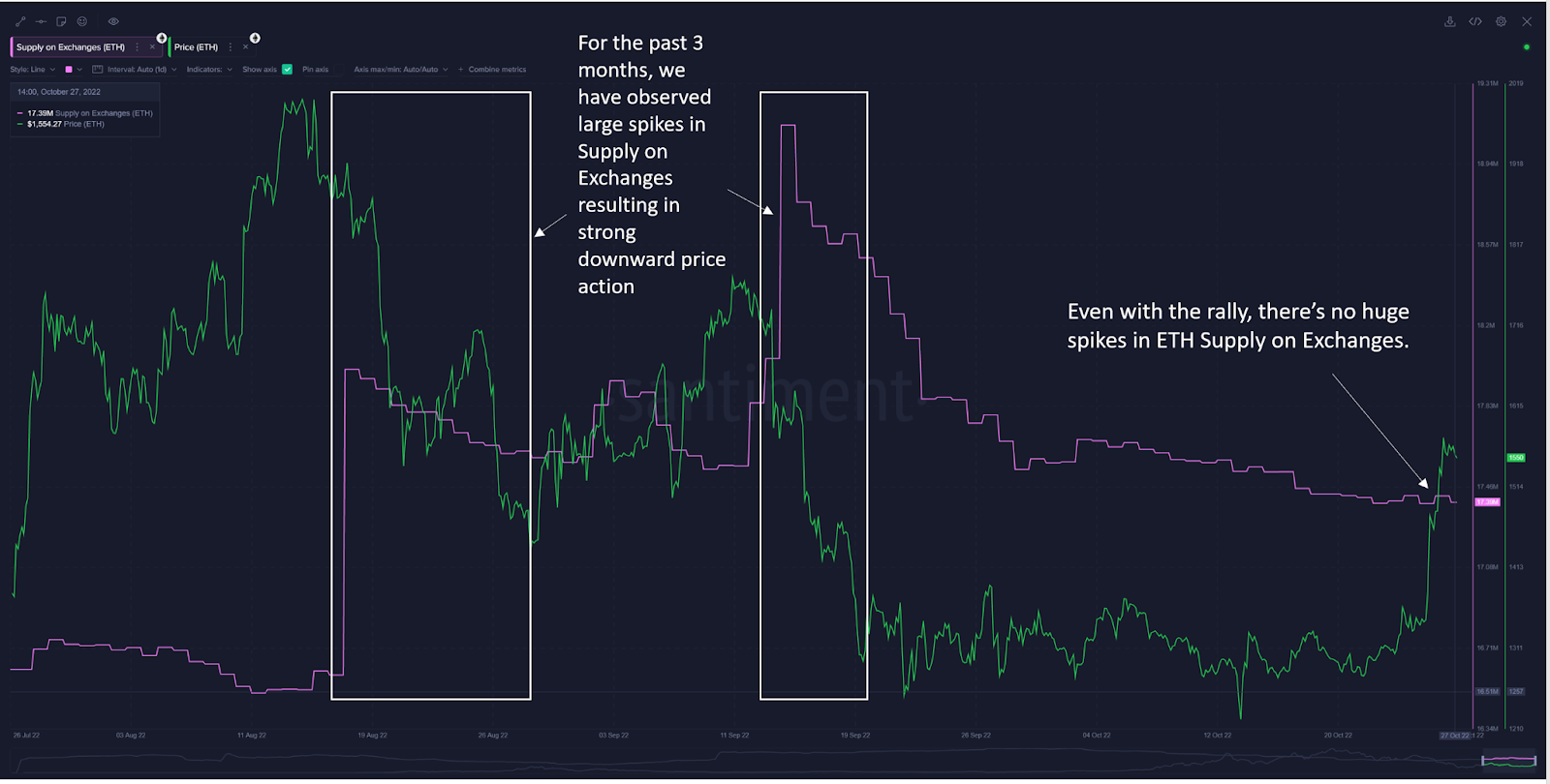 Khi giá Ethereum tăng trong một khoảng thời gian ngắn vào tháng 8 và tháng 9, nguồn cung ETH trên các sàn giao dịch đã tăng vọt, được biểu thị bằng đường màu tím. Tuy nhiên, như đã thấy trong biểu đồ từ Santiment, không có sự tăng đột biến nào về nguồn cung ETH trên các sàn hiện tại.