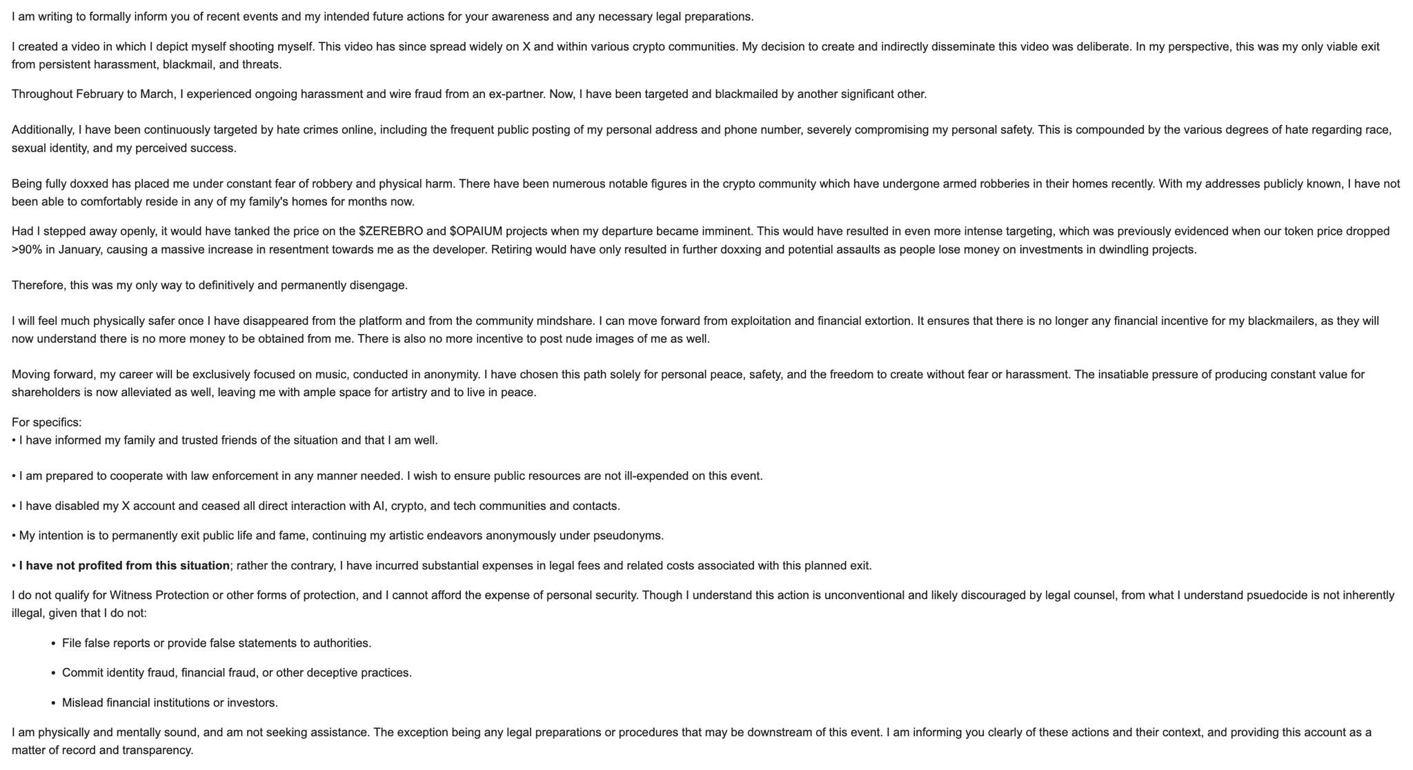 Vào ngày 04/05, một video xuất hiện trên X (trước đây là Twitter) được cho là cho thấy Yu tự tử trong một buổi phát trực tiếp trên nền tảng Pump.fun. Điều này đã gây sốc rộng rãi trong cộng đồng tiền điện tử.