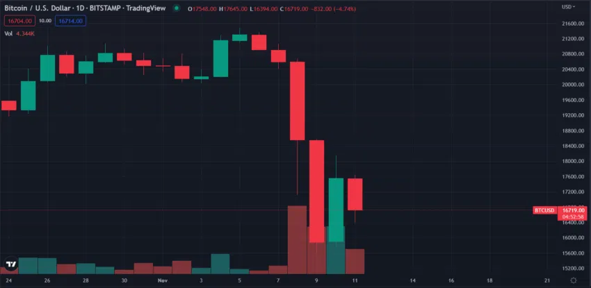 Dễ thấy nhất, Bitcoin đã giảm xuống khoảng 16,750 USD sau khi tăng lên 17,500 USD khi kết quả CPI được công bố vào ngày 10/11/2022. Giá BTC giảm hơn 70% kể từ khi đạt mức cao nhất mọi thời đại khoảng 69,000 USD vào cùng ngày này năm ngoái.