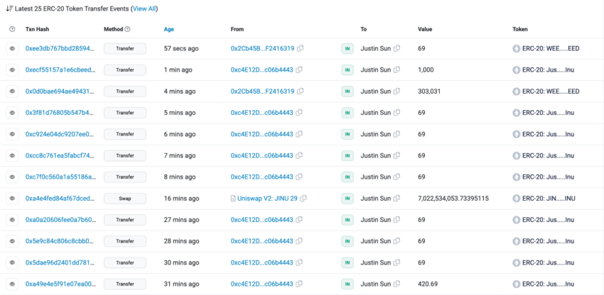 Vào tháng 10 năm 2022, nền tảng phân tích trực tuyến Lookonchain báo cáo rằng một số người dùng đã bị mất Ethereum (ETH) khi giao dịch token Justin Sun Inu. Những kẻ lừa đảo đã chuyển memecoin sang ví công khai của những người nổi tiếng.