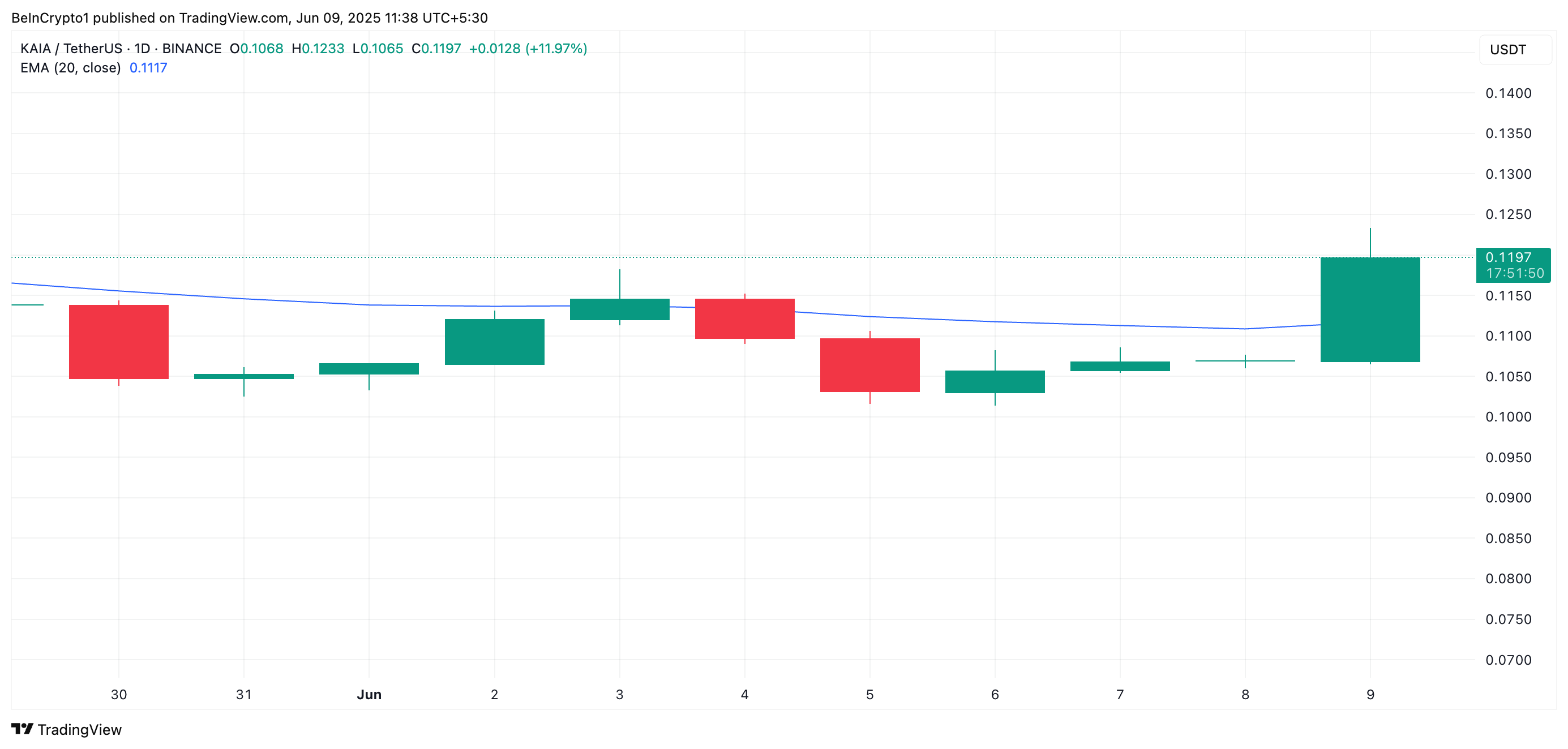 KAIA, token gốc của blockchain hiệu suất cao Kaia, là đồng tiền tăng giá mạnh nhất hôm nay. Altcoin này đã tăng 12% trong 24 giờ qua và đạt mức giá cao nhất trong 18 ngày qua.