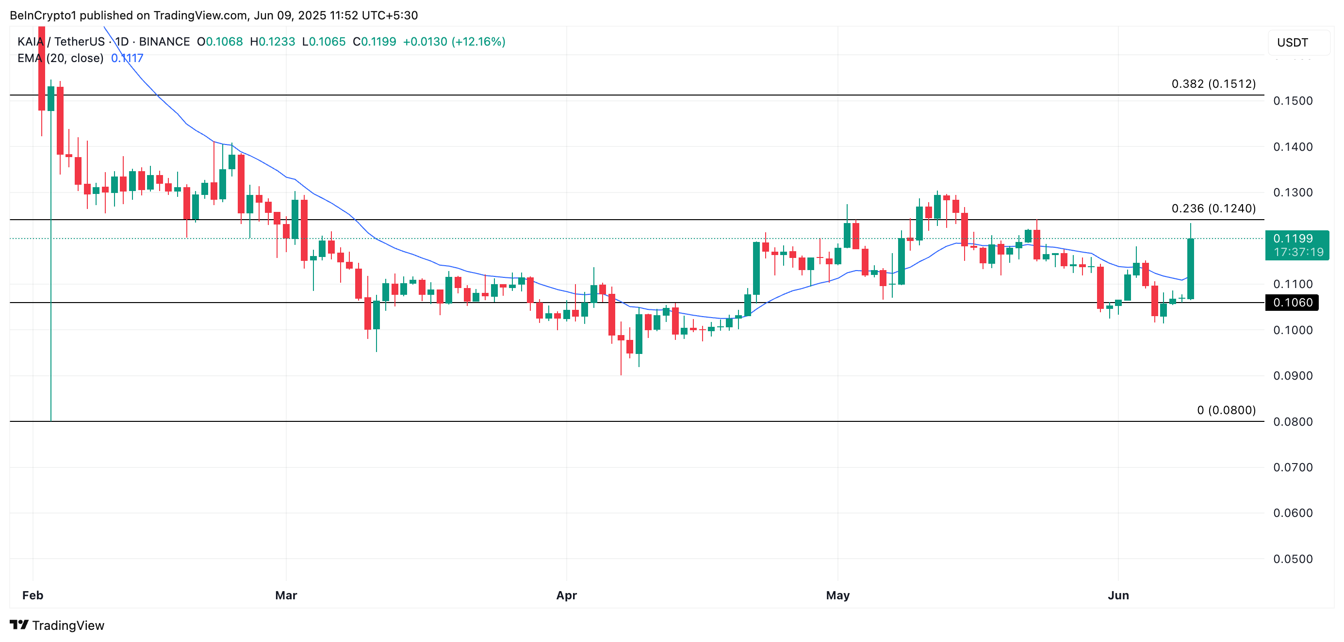 Tại thời điểm viết bài, KAIA đang giao dịch ở mức cao nhất trong 18 ngày là 0.119 USD. Đợt tăng hai chữ số này đi kèm với sự gia tăng khối lượng giao dịch hàng ngày, tăng 920% trong ngày qua, và đạt mức cao nhất trong nhiều tháng là 62 triệu USD.