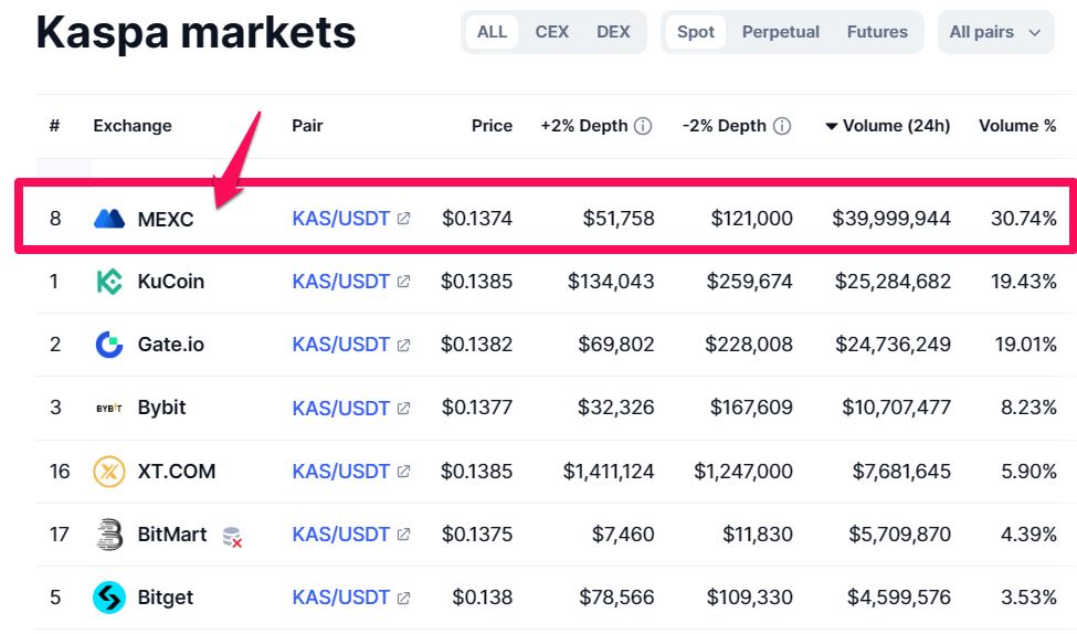 - Khối lượng KAS được tập trung chủ yếu trên sàn sàn MEXC. Đến 30% khối lượng giao dịch 24h của KAS trên sàn này, chứng tỏ cá mập trên MEXC đang gom KAS mạnh mẽ nhất, trở thành động lực thúc đẩy lớn nhất cho giá. Việc KAS niêm yết trên Binance cũng chỉ là hợp đồng vĩnh viễn, không phải là giao dịch giao ngay.